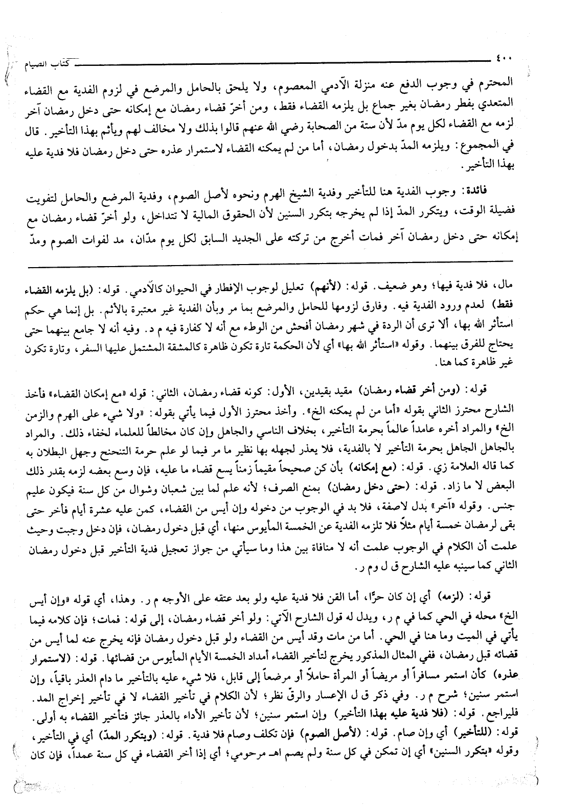 الْمُحْتَرَمَ فِي وُجُوبِ الدَّفْعِ عَنْهُ مَنْزِلَةَ الْآدَمِيِّ الْمَعْصُومِ، وَلَا يُلْحَقُ بِالْحَامِلِ وَالْمُرْضِعِ فِي لُزُومِ الْفِدْيَةِ مَعَ الْقَضَاءِ الْمُتَعَدِّي بِفِطْرِ رَمَضَانَ بِغَيْرِ جِمَاعٍ بَلْ يَلْزَمُهُ الْقَضَاءُ فَقَطْ، وَمَنْ أَخَّرَ قَضَاءَ رَمَضَانَ مَعَ إمْكَانِهِ حَتَّى دَخَلَ رَمَضَانُ آخَرُ لَزِمَهُ مَعَ الْقَضَاءِ لِكُلِّ يَوْمٍ مُدٌّ لِأَنَّ سِتَّةً مِنْ الصَّحَابَةِ - رَضِيَ اللَّهُ عَنْهُمْ - قَالُوا بِذَلِكَ وَلَا مُخَالِفَ لَهُمْ وَيَأْثَمُ بِهَذَا التَّأْخِيرِ.