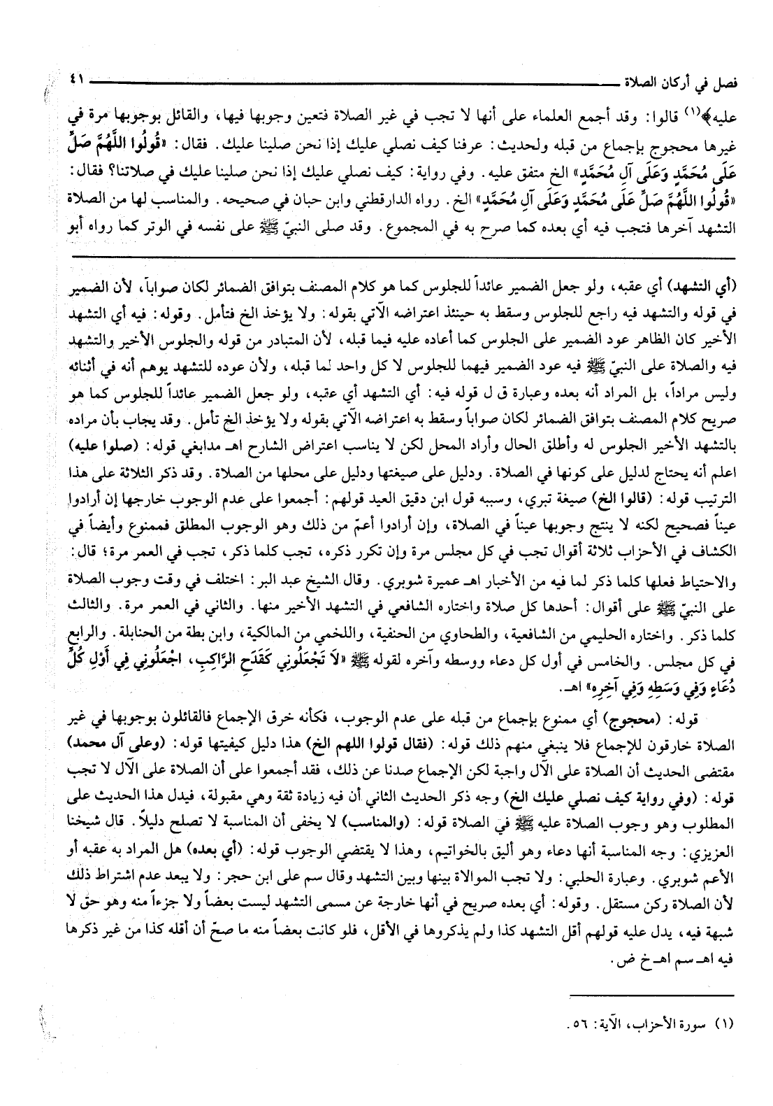 ـــــــــــــــــــــــــــــQأَيْ التَّشَهُّدِ) أَيْ عَقِبَهُ، وَلَوْ جُعِلَ الضَّمِيرُ عَائِدًا لِلْجُلُوسِ كَمَا هُوَ كَلَامُ الْمُصَنِّفِ بِتَوَافُقِ الضَّمَائِرِ لَكَانَ صَوَابًا، لِأَنَّ الضَّمِيرَ فِي قَوْلِهِ وَالتَّشَهُّدُ فِيهِ رَاجِعٌ لِلْجُلُوسِ وَسَقَطَ بِهِ حِينَئِذٍ اعْتِرَاضُهُ الْآتِي بِقَوْلِهِ: وَلَا يُؤْخَذُ إلَخْ فَتَأَمَّلْ. وَقَوْلُهُ: فِيهِ أَيْ التَّشَهُّدِ الْأَخِيرِ كَانَ الظَّاهِرُ عَوْدَ الضَّمِيرِ عَلَى الْجُلُوسِ كَمَا أَعَادَهُ عَلَيْهِ فِيمَا قَبْلَهُ، لِأَنَّ الْمُتَبَادَرَ مِنْ قَوْلِهِ وَالْجُلُوسُ الْأَخِيرُ وَالتَّشَهُّدُ فِيهِ وَالصَّلَاةُ عَلَى النَّبِيِّ - صَلَّى اللَّهُ عَلَيْهِ وَسَلَّمَ - فِيهِ عَوْدُ الضَّمِيرِ فِيهِمَا لِلْجُلُوسِ لَا كُلُّ وَاحِدٍ لِمَا قَبْلَهُ، وَلِأَنَّ عَوْدَهُ لِلتَّشَهُّدِ يُوهِمُ أَنَّهُ فِي أَثْنَائِهِ وَلَيْسَ مُرَادًا، بَلْ الْمُرَادُ أَنَّهُ بَعْدَهُ وَعِبَارَةُ ق ل قَوْلُهُ فِيهِ: أَيْ التَّشَهُّدِ أَيْ عَقِبَهُ، لَوْ جُعِلَ الضَّمِيرُ عَائِدًا لِلْجُلُوسِ كَمَا هُوَ صَرِيحُ كَلَامِ الْمُصَنِّفِ بِتَوَافُقِ الضَّمَائِرِ لَكَانَ صَوَابًا وَسَقَطَ بِهِ اعْتِرَاضُهُ الْآتِي بِقَوْلِهِ وَلَا يُؤْخَذُ إلَخْ تَأَمَّلْ. وَقَدْ يُجَابُ بِأَنَّ مُرَادَهُ بِالتَّشَهُّدِ الْأَخِيرِ الْجُلُوسُ لَهُ وَأَطْلَقَ الْحَالَ وَأَرَادَ الْمَحَلَّ لَكِنْ لَا يُنَاسِبُ اعْتِرَاضَ الشَّارِحِ. اهـ. مَدَابِغِيٌّ قَوْلُهُ: (صَلُّوا عَلَيْهِ) اعْلَمْ أَنَّهُ يَحْتَاجُ لِدَلِيلٍ عَلَى كَوْنِهَا فِي الصَّلَاةِ. وَدَلِيلٍ عَلَى صِيغَتِهَا وَدَلِيلٍ عَلَى مَحَلِّهَا مِنْ الصَّلَاةِ. وَقَدْ ذَكَرَ الثَّلَاثَةَ عَلَى هَذَا التَّرْتِيبِ قَوْلُهُ: (قَالُوا إلَخْ) صِيغَةُ تَبَرِّي، وَسَبَبُهُ قَوْلُ ابْنِ دَقِيقِ الْعِيدِ قَوْلُهُمْ: أَجْمَعُوا عَلَى عَدَمِ الْوُجُوبِ خَارِجَهَا إنْ أَرَادُوا عَيْنًا فَصَحِيحٌ لَكِنَّهُ لَا يُنْتِجُ وُجُوبَهَا عَيْنًا فِي الصَّلَاةِ، وَإِنْ أَرَادُوا أَعَمَّ مِنْ ذَلِكَ وَهُوَ الْوُجُوبُ الْمُطْلَقُ فَمَمْنُوعٌ وَأَيْضًا فِي الْكَشَّافِ فِي الْأَحْزَابِ ثَلَاثَةٌ أَقْوَالٍ تَجِبُ فِي كُلِّ مَجْلِسٍ مَرَّةً وَإِنْ تَكَرَّرَ ذِكْرُهُ، تَجِبُ كُلَّمَا ذُكِرَ، تَجِبُ فِي الْعُمْرِ مَرَّةً؛ قَالَ: وَالِاحْتِيَاطُ فِعْلُهَا كُلَّمَا ذُكِرَ لِمَا فِيهِ مِنْ الْأَخْبَارِ. اهـ. عَمِيرَةُ شَوْبَرِيٌّ. وَقَالَ الشَّيْخُ عَبْدُ الْبَرِّ: اُخْتُلِفَ فِي وَقْتِ وُجُوبِ الصَّلَاةِ عَلَى النَّبِيِّ - صَلَّى اللَّهُ عَلَيْهِ وَسَلَّمَ - عَلَى أَقْوَالٍ: أَحَدُهَا كُلُّ صَلَاةٍ وَاخْتَارَهُ الشَّافِعِيُّ فِي التَّشَهُّدِ الْأَخِيرِ مِنْهَا. وَالثَّانِي فِي الْعُمْرِ مَرَّةً. وَالثَّالِثُ كُلَّمَا ذُكِرَ. وَاخْتَارَهُ الْحَلِيمِيُّ مِنْ الشَّافِعِيَّةِ، وَالطَّحَاوِيُّ مِنْ الْحَنَفِيَّةِ، وَاللَّخْمِيُّ مِنْ الْمَالِكِيَّةِ، وَابْنُ بَطَّةَ مِنْ الْحَنَابِلَةِ. وَالرَّابِعُ فِي كُلِّ مَجْلِسٍ. وَالْخَامِسُ فِي أَوَّلِ كُلِّ دُعَاءٍ وَوَسَطِهِ وَآخِرِهِ لِقَوْلِهِ - صَلَّى اللَّهُ عَلَيْهِ وَسَلَّمَ - «لَا تَجْعَلُونِي كَقَدَحِ الرَّاكِبِ، اجْعَلُونِي فِي أَوَّلِ كُلِّ دُعَاءٍ وَفِي وَسَطِهِ وَفِي آخِرِهِ» اهـ.