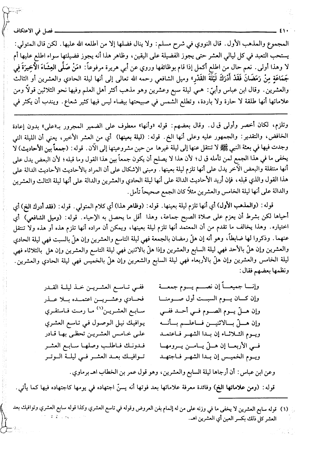 الْمَجْمُوعِ وَالْمَذْهَبُ الْأَوَّلُ قَالَ النَّوَوِيُّ فِي شَرْحِ مُسْلِمٍ وَلَا يَنَالُ فَضْلَهَا إلَّا مَنْ أَطْلَعَهُ اللَّهُ عَلَيْهَا لَكِنْ قَالَ الْمُتَوَلِّي يُسْتَحَبُّ التَّعَبُّدُ فِي كُلِّ لَيَالِيِ الْعَشْرِ حَتَّى يَجُوزَ الْفَضِيلَةُ عَلَى الْيَقِينِ وَظَاهِرُ هَذَا أَنَّهُ يَجُوزُ فَضِيلَتُهَا سَوَاءٌ اطَّلَعَ عَلَيْهَا أَمْ لَا وَهَذَا أَوْلَى نَعَمْ حَالُ مَنْ اطَّلَعَ أَكْمَلُ إذَا أَقَامَ وَظَائِفَهَا وَرُوِيَ عَنْ أَبِي هُرَيْرَةَ مَرْفُوعًا «مَنْ صَلَّى الْعِشَاءَ الْأَخِيرَةَ فِي جَمَاعَةٍ مِنْ رَمَضَانَ فَقَدْ أَدْرَكَ لَيْلَةَ الْقَدْرِ» وَمَيْلُ الشَّافِعِيِّ - رَحِمَهُ اللَّهُ تَعَالَى - إلَى أَنَّهَا لَيْلَةُ الْحَادِي وَالْعِشْرِينَ أَوْ الثَّالِثِ وَالْعِشْرِينَ وَقَالَ ابْنُ عَبَّاسٍ وَأَبِي هِيَ لَيْلَةُ سَبْعٍ وَعِشْرِينَ وَهُوَ مَذْهَبُ أَكْثَرِ أَهْلِ الْعِلْمِ وَفِيهَا نَحْوُ الثَّلَاثِينَ قَوْلًا وَمِنْ عَلَامَاتِهَا أَنَّهَا طَلِقَةٌ لَا حَارَّةً وَلَا بَارِدَةً وَتَطْلُعُ الشَّمْسُ فِي صَبِيحَتِهَا بَيْضَاءَ لَيْسَ فِيهَا كَثِيرُ شُعَاعٍ وَيَنْدُبُ أَنْ يَكْثُرَ فِي