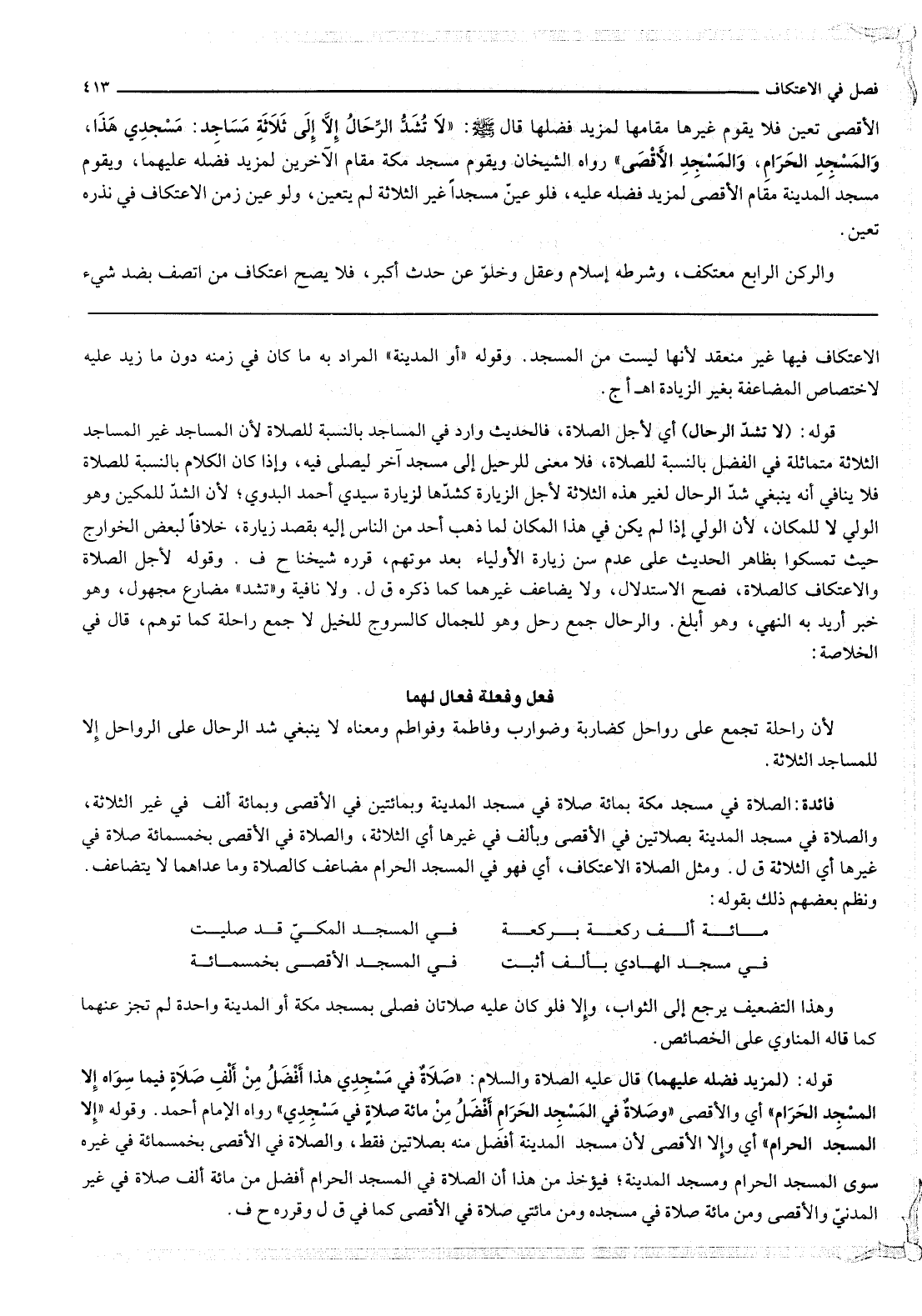 قَوْلُهُ: (لِمَزِيدِ فَضْلِهِ عَلَيْهِمَا) قَالَ - عَلَيْهِ الصَّلَاةُ وَالسَّلَامُ -: «صَلَاةٌ فِي مَسْجِدِي هَذَا أَفْضَلُ مِنْ أَلْفِ صَلَاةٍ فِيمَا سِوَاهُ إلَّا الْمَسْجِدَ الْحَرَامَ» أَيْ وَالْأَقْصَى «وَصَلَاةٌ فِي الْمَسْجِدِ الْحَرَامِ أَفْضَلُ مِنْ مِائَةِ صَلَاةٍ فِي مَسْجِدِي» رَوَاهُ الْإِمَامُ أَحْمَدُ. وَقَوْلُهُ " إلَّا الْمَسْجِدَ الْحَرَامَ " أَيْ وَإِلَّا الْأَقْصَى لِأَنَّ مَسْجِدَ الْمَدِينَةِ أَفْضَلُ مِنْهُ بِصَلَاتَيْنِ فَقَطْ، وَالصَّلَاةُ فِي الْأَقْصَى بِخَمْسِمِائَةٍ فِي غَيْرِهِ سِوَى الْمَسْجِدِ الْحَرَامِ وَمَسْجِدِ الْمَدِينَةِ؛ فَيُؤْخَذُ مِنْ هَذَا أَنَّ الصَّلَاةَ فِي الْمَسْجِدِ الْحَرَامِ أَفْضَلُ مِنْ مِائَةِ أَلْفِ صَلَاةٍ فِي غَيْرِ الْمَدَنِيِّ وَالْأَقْصَى وَمِنْ مِائَةِ صَلَاةٍ فِي مَسْجِدِهِ وَمِنْ مِائَتَيْ صَلَاةٍ فِي الْأَقْصَى كَمَا فِي ق ل وَقَرَّرَهُ ح ف.