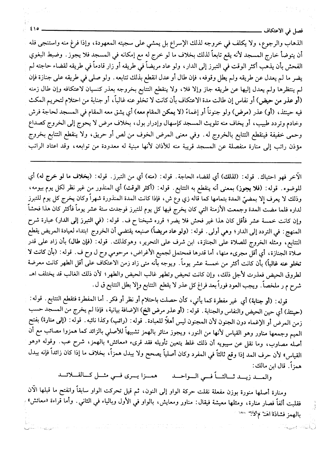 الذَّهَابِ وَالرُّجُوعِ، وَلَا يُكَلِّفُ فِي خُرُوجِهِ لِذَلِكَ الْإِسْرَاعِ بَلْ يَمْشِي عَلَى سَجِيَّتِهِ الْمَعْهُودَةِ، وَإِذَا فَرَغَ مِنْهُ وَاسْتَنْجَى فَلَهُ أَنْ يَتَوَضَّأَ خَارِجَ الْمَسْجِدِ لِأَنَّهُ يَقَعُ تَابِعًا لِذَلِكَ بِخِلَافِ مَا لَوْ خَرَجَ لَهُ مَعَ إمْكَانِهِ فِي الْمَسْجِدِ فَلَا يَجُوزُ. وَضَبَطَ الْبَغَوِيّ الْفُحْشَ بِأَنْ يَذْهَبَ أَكْثَرُ الْوَقْتِ فِي التَّبَرُّزِ إلَى الدَّارِ، وَلَوْ عَادَ مَرِيضًا فِي طَرِيقِهِ أَوْ زَارَ قَادِمًا فِي طَرِيقِهِ لِقَضَاءِ حَاجَتِهِ لَمْ يَضُرَّ مَا لَمْ يَعْدِلْ عَنْ طَرِيقِهِ وَلَمْ يَطُلْ وُقُوفُهُ، فَإِنْ طَالَ أَوْ عَدَلَ انْقَطَعَ بِذَلِكَ تَتَابُعُهُ. وَلَوْ صَلَّى فِي طَرِيقِهِ عَلَى جِنَازَةٍ فَإِنْ لَمْ يَنْتَظِرْهَا وَلَمْ يَعْدِلْ إلَيْهَا عَنْ طَرِيقِهِ جَازَ وَإِلَّا فَلَا، وَلَا يَنْقَطِعُ التَّتَابُعُ بِخُرُوجِهِ بِعُذْرٍ كَنِسْيَانٍ لِاعْتِكَافِهِ وَإِنْ طَالَ زَمَنُهُ (أَوْ عُذْرٍ مِنْ حَيْضٍ) أَوْ نِفَاسٍ إنْ طَالَتْ مُدَّةُ الِاعْتِكَافِ بِأَنْ كَانَتْ لَا تَخْلُو عَنْهُ غَالِبًا، أَوْ جَنَابَةٍ مِنْ احْتِلَامٍ لِتَحْرِيمِ الْمُكْثِ فِيهِ حِينَئِذٍ (أَوْ) عُذْرِ (مَرَضٍ) وَلَوْ جُنُونًا أَوْ إغْمَاءً (لَا يُمْكِنُ الْمَقَامُ مَعَهُ) أَيْ يَشُقُّ مَعَهُ الْمَقَامُ فِي الْمَسْجِدِ لِحَاجَةِ فُرُشٍ وَخَادِمٍ وَتَرَدُّدِ طَبِيبٍ، أَوْ يَخَافُ مِنْهُ تَلْوِيثُ الْمَسْجِدِ كَإِسْهَالٍ وَإِدْرَارِ بَوْلٍ، بِخِلَافِ مَرَضٍ لَا يُحْوِجُ إلَى الْخُرُوجِ كَصُدَاعٍ وَحُمَّى خَفِيفَةٍ فَيَنْقَطِعُ التَّتَابُعُ بِالْخُرُوجِ لَهُ. وَفِي مَعْنَى الْمَرَضِ الْخَوْفُ مِنْ لِصٍّ أَوْ حَرِيقٍ، وَلَا يَنْقَطِعُ التَّتَابُعُ بِخُرُوجِ مُؤَذِّنٍ رَاتِبٍ إلَى مَنَارَةٍ مُنْفَصِلَةٍ عَنْ الْمَسْجِدِ قَرِيبَةٍ مِنْهُ لِلْأَذَانِ لِأَنَّهَا مَبْنِيَّةٌ لَهُ مَعْدُودَةٌ مِنْ تَوَابِعِهِ، وَقَدْ اعْتَادَ الرَّاتِبُ
