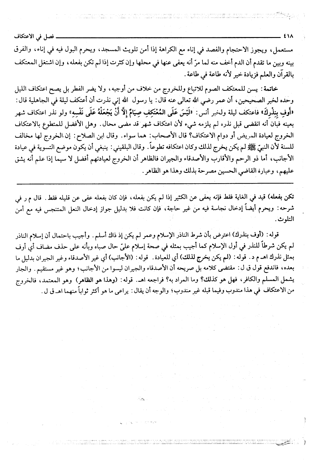 خَاتِمَةٌ: يُسَنُّ لِلْمُعْتَكِفِ الصَّوْمُ لِلِاتِّبَاعِ وَلِلْخُرُوجِ مِنْ خِلَافِ مَنْ أَوْجَبَهُ، وَلَا يَضُرُّ الْفِطْرُ بَلْ يَصِحُّ اعْتِكَافُ اللَّيْلِ وَحْدَهُ لِخَبَرِ الصَّحِيحَيْنِ، «أَنَّ عُمَرَ - رَضِيَ اللَّهُ تَعَالَى عَنْهُ - قَالَ: يَا رَسُولَ اللَّهِ إنِّي نَذَرْتُ أَنْ أَعْتَكِفَ لَيْلَةً فِي الْجَاهِلِيَّةِ قَالَ: أَوْفِ بِنَذْرِك» فَاعْتَكَفَ لَيْلَةً وَلِخَبَرِ أَنَسٍ: «لَيْسَ عَلَى الْمُعْتَكِفِ صِيَامٌ إلَّا أَنْ يَجْعَلَهُ عَلَى نَفْسِهِ» وَلَوْ نَذَرَ اعْتِكَافَ شَهْرٍ بِعَيْنِهِ فَبَانَ أَنَّهُ انْقَضَى قَبْلَ نَذْرِهِ لَمْ يَلْزَمْهُ شَيْءٌ لِأَنَّ اعْتِكَافَ شَهْرٍ قَدْ مَضَى مُحَالٌ. وَهَلْ الْأَفْضَلُ لِلْمُتَطَوِّعِ بِالِاعْتِكَافِ الْخُرُوجُ لِعِيَادَةِ الْمَرِيضِ أَوْ دَوَامِ الِاعْتِكَافِ؟ قَالَ الْأَصْحَابُ: هُمَا سَوَاءٌ. وَقَالَ ابْنُ الصَّلَاحِ: إنَّ الْخُرُوجَ لَهَا مُخَالِفٌ لِلسُّنَّةِ لِأَنَّ النَّبِيَّ - صَلَّى اللَّهُ عَلَيْهِ وَسَلَّمَ - لَمْ يَكُنْ يَخْرُجُ لِذَلِكَ وَكَانَ اعْتِكَافُهُ تَطَوُّعًا. وَقَالَ الْبُلْقِينِيُّ: يَنْبَغِي أَنْ يَكُونَ مَوْضِعُ التَّسْوِيَةِ فِي عِيَادَةِ الْأَجَانِبِ، أَمَّا ذُو الرَّحِمِ وَالْأَقَارِبِ وَالْأَصْدِقَاءِ وَالْجِيرَانِ فَالظَّاهِرُ أَنَّ الْخُرُوجَ لِعِيَادَتِهِمْ أَفْضَلُ لَا سِيَّمَا إذَا عَلِمَ أَنَّهُ يَشُقُّ عَلَيْهِمْ، وَعِبَارَةُ الْقَاضِي الْحُسَيْنِ مُصَرَّحَةٌ بِذَلِكَ وَهَذَا هُوَ الظَّاهِرُ.