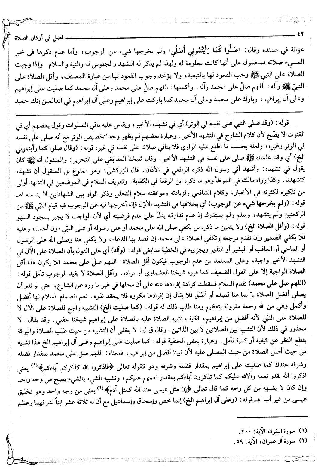 عَوَانَةَ فِي مُسْنَدِهِ وَقَالَ: «صَلُّوا كَمَا رَأَيْتُمُونِي أُصَلِّي» وَلَمْ يُخْرِجْهَا شَيْءٌ عَنْ الْوُجُوبِ، وَأَمَّا عَدَمُ ذِكْرِهَا فِي خَبَرِ الْمُسِيءِ صَلَاتَهُ فَمَحْمُولٌ عَلَى أَنَّهَا كَانَتْ مَعْلُومَةً لَهُ وَلِهَذَا لَمْ يُذْكَرْ لَهُ التَّشَهُّدُ وَالْجُلُوسُ لَهُ وَالنِّيَّةُ وَالسَّلَامُ. وَإِذَا وَجَبَتْ الصَّلَاةُ عَلَى النَّبِيِّ - صَلَّى اللَّهُ عَلَيْهِ وَسَلَّمَ - وَجَبَ الْقُعُودُ لَهَا بِالتَّبَعِيَّةِ، وَلَا يُؤْخَذُ وُجُوبُ الْقُعُودِ لَهَا مِنْ عِبَارَةِ الْمُصَنِّفِ، وَأَقَلُّ الصَّلَاةِ عَلَى النَّبِيِّ - صَلَّى اللَّهُ عَلَيْهِ وَسَلَّمَ - وَآلِهِ: «اللَّهُمَّ صَلِّ عَلَى مُحَمَّدٍ وَآلِهِ. وَأَكْمَلُهَا: اللَّهُمَّ صَلِّ عَلَى مُحَمَّدٍ وَعَلَى آلِ مُحَمَّدٍ كَمَا صَلَّيْت عَلَى إبْرَاهِيمَ وَعَلَى آلِ إبْرَاهِيمَ، وَبَارِكْ عَلَى مُحَمَّدٍ وَعَلَى آلِ مُحَمَّدٍ كَمَا بَارَكْت عَلَى إبْرَاهِيمَ وَعَلَى آلِ إبْرَاهِيمَ فِي الْعَالَمِينَ إنَّك حَمِيدٌ