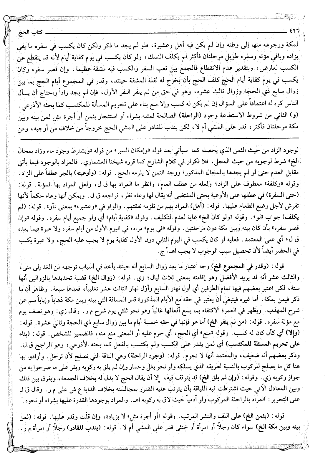 لِمَكَّةَ وَرُجُوعِهِ مِنْهَا إلَى وَطَنِهِ وَإِنْ لَمْ يَكُنْ فِيهِ أَهْلٌ وَعَشِيرَةٌ، فَلَوْ لَمْ يَجِدْ مَا ذُكِرَ وَلَكِنْ كَانَ يَكْسِبُ فِي سَفَرِهِ مَا يَفِي بِزَادِهِ وَبَاقِي مُؤَنِهِ وَسَفَرِهِ طَوِيلٌ مَرْحَلَتَانِ فَأَكْثَرُ لَمْ يُكَلِّفْ النُّسُكَ، وَلَوْ كَانَ يَكْسِبُ فِي يَوْمٍ كِفَايَةَ أَيَّامٍ لِأَنَّهُ قَدْ يَنْقَطِعُ عَنْ الْكَسْبِ لِعَارِضٍ، وَبِتَقْدِيرِ عَدَمِ الِانْقِطَاعِ فَالْجَمْعُ بَيْنَ تَعَبِ السَّفَرِ وَالْكَسْبِ فِيهِ مَشَقَّةٌ عَظِيمَةٌ، وَإِنْ قَصُرَ سَفَرُهُ وَكَانَ يَكْسِبُ فِي يَوْمٍ كِفَايَةَ أَيَّامِ الْحَجِّ كُلِّفَ الْحَجَّ بِأَنْ يَخْرُجَ لَهُ لِقِلَّةِ الْمَشَقَّةِ حِينَئِذٍ، وَقَدَّرَ فِي الْمَجْمُوعِ أَيَّامَ الْحَجِّ بِمَا بَيْنَ زَوَالِ سَابِعِ ذِي الْحِجَّةِ وَزَوَالِ ثَالِثِ عَشْرَةَ، وَهُوَ فِي حَقِّ مَنْ لَمْ يَنْفِرْ النَّفْرَ الْأَوَّلَ، فَإِنْ لَمْ يَجِدْ زَادًا وَاحْتَاجَ أَنْ يَسْأَلَ النَّاسَ كُرِهَ لَهُ اعْتِمَادًا عَلَى السُّؤَالِ إنْ لَمْ يَكُنْ لَهُ كَسْبٌ وَإِلَّا مُنِعَ بِنَاءً عَلَى تَحْرِيمِ الْمَسْأَلَةِ لِلْمُكْتَسِبِ كَمَا بَحَثَهُ الْأَذْرَعِيُّ.