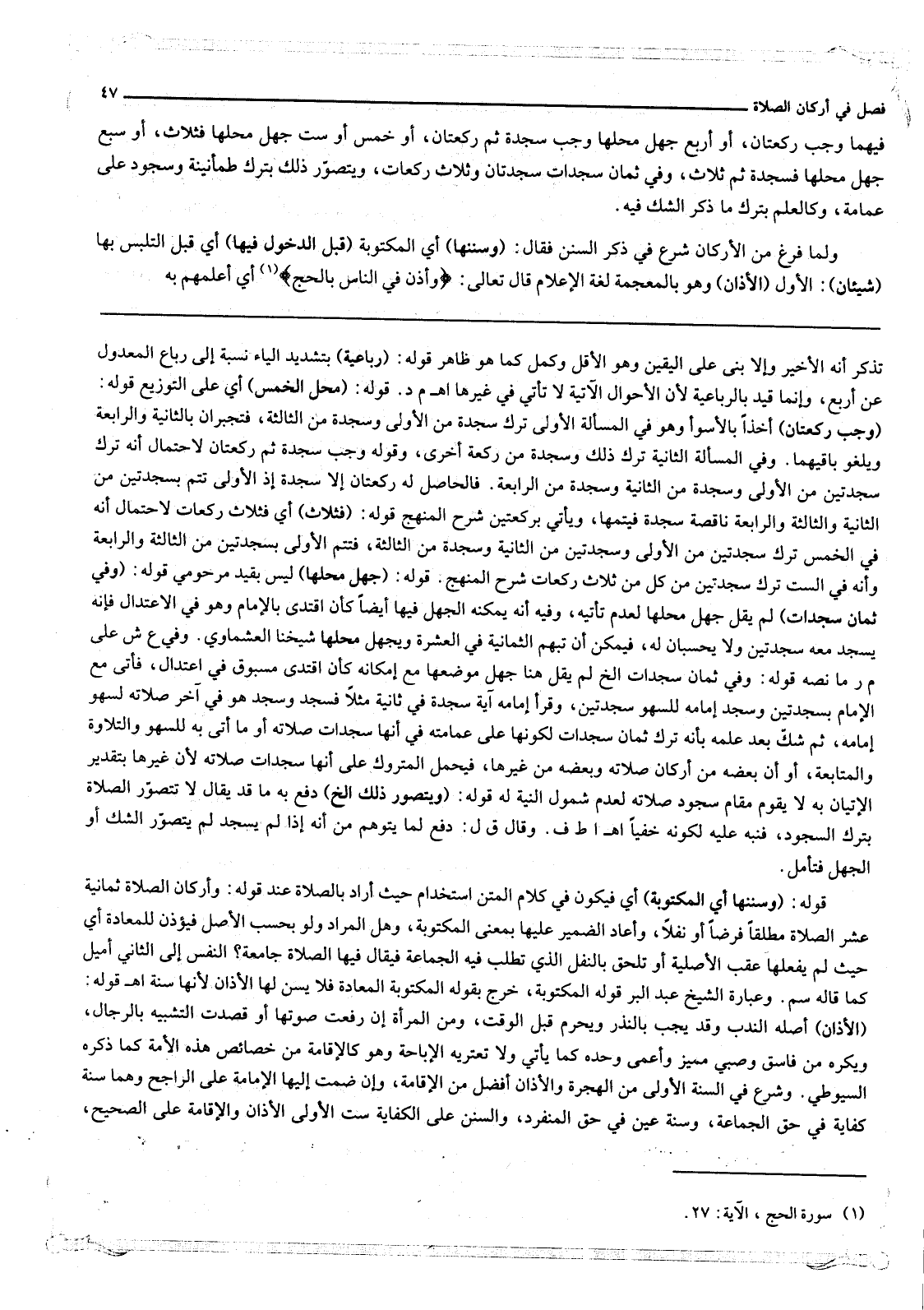 وَلَمَّا فَرَغَ مِنْ الْأَرْكَانِ شَرَعَ فِي ذِكْرِ السُّنَنِ فَقَالَ: (وَسُنَنُهَا) أَيْ الْمَكْتُوبَةِ (قَبْلَ الدُّخُولِ فِيهَا) أَيْ قَبْلَ التَّلَبُّسِ بِهَا (شَيْئَانِ) : الْأَوَّلُ (الْأَذَانُ) وَهُوَ بِالْمُعْجَمَةِ لُغَةً الْإِعْلَامُ قَالَ تَعَالَى {وَأَذِّنْ فِي النَّاسِ بِالْحَجِّ} [الحج: 27] أَيْ أَعْلِمْهُمْ بِهِ
