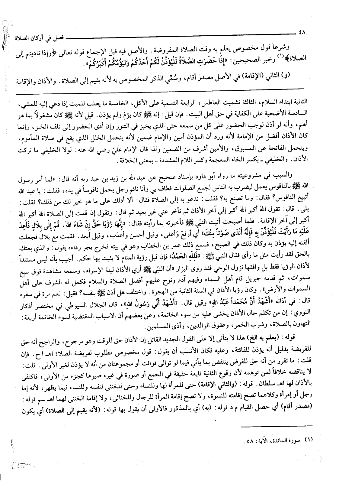 وَشَرْعًا قَوْلٌ مَخْصُوصٌ يُعْلَمُ بِهِ وَقْتُ الصَّلَاةِ الْمَفْرُوضَةِ وَالْأَصْلُ فِيهِ قَبْلَ الْإِجْمَاعِ قَوْله تَعَالَى {وَإِذَا نَادَيْتُمْ إِلَى الصَّلاةِ} [المائدة: 58] وَخَبَرُ الصَّحِيحَيْنِ «إذَا حَضَرَتْ الصَّلَاةُ فَلْيُؤَذِّنْ لَكُمْ أَحَدُكُمْ وَلْيَؤُمَّكُمْ أَكْبَرُكُمْ»