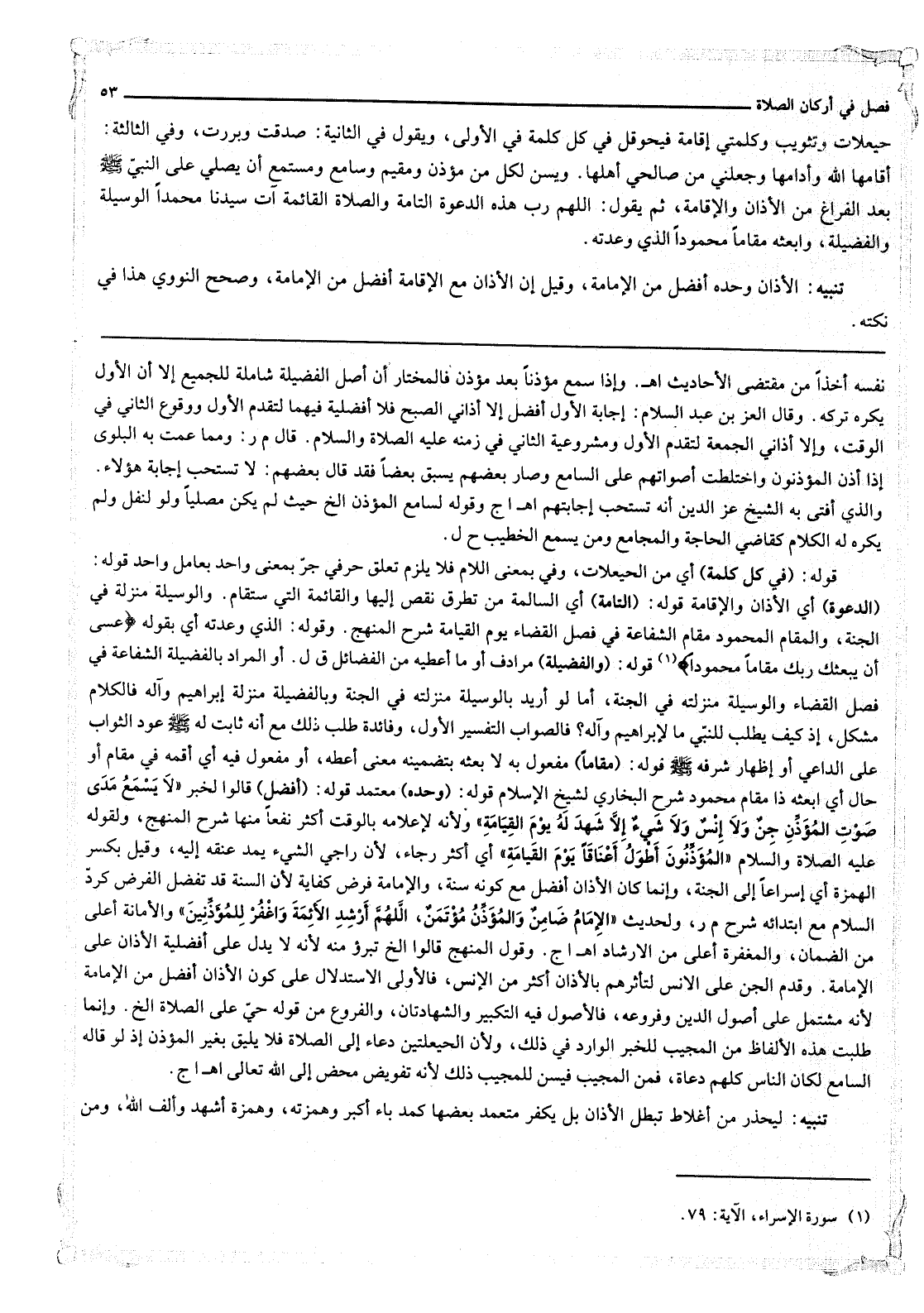 وَيُسَنُّ لِكُلٍّ مِنْ مُؤَذِّنٍ وَمُقِيمٍ وَسَامِعٍ وَمُسْتَمِعٍ أَنْ يُصَلِّيَ عَلَى النَّبِيِّ - صَلَّى اللَّهُ عَلَيْهِ وَسَلَّمَ - بَعْدَ الْفَرَاغِ مِنْ الْأَذَانِ وَالْإِقَامَةِ، ثُمَّ يَقُولُ: اللَّهُمَّ رَبَّ هَذِهِ الدَّعْوَةِ التَّامَّةِ وَالصَّلَاةِ الْقَائِمَةِ آتِ سَيِّدَنَا مُحَمَّدًا الْوَسِيلَةَ وَالْفَضِيلَةَ، وَابْعَثْهُ مَقَامًا مَحْمُودًا الَّذِي وَعَدَّتْهُ. تَنْبِيهٌ: الْأَذَانُ وَحْدَهُ أَفْضَلُ مِنْ الْإِمَامَةِ، وَقِيلَ إنَّ الْأَذَانَ مَعَ الْإِقَامَةِ أَفْضَلُ مِنْ الْإِمَامَةِ، وَصَحَّحَ النَّوَوِيُّ هَذَا فِي نُكَتِهِ.