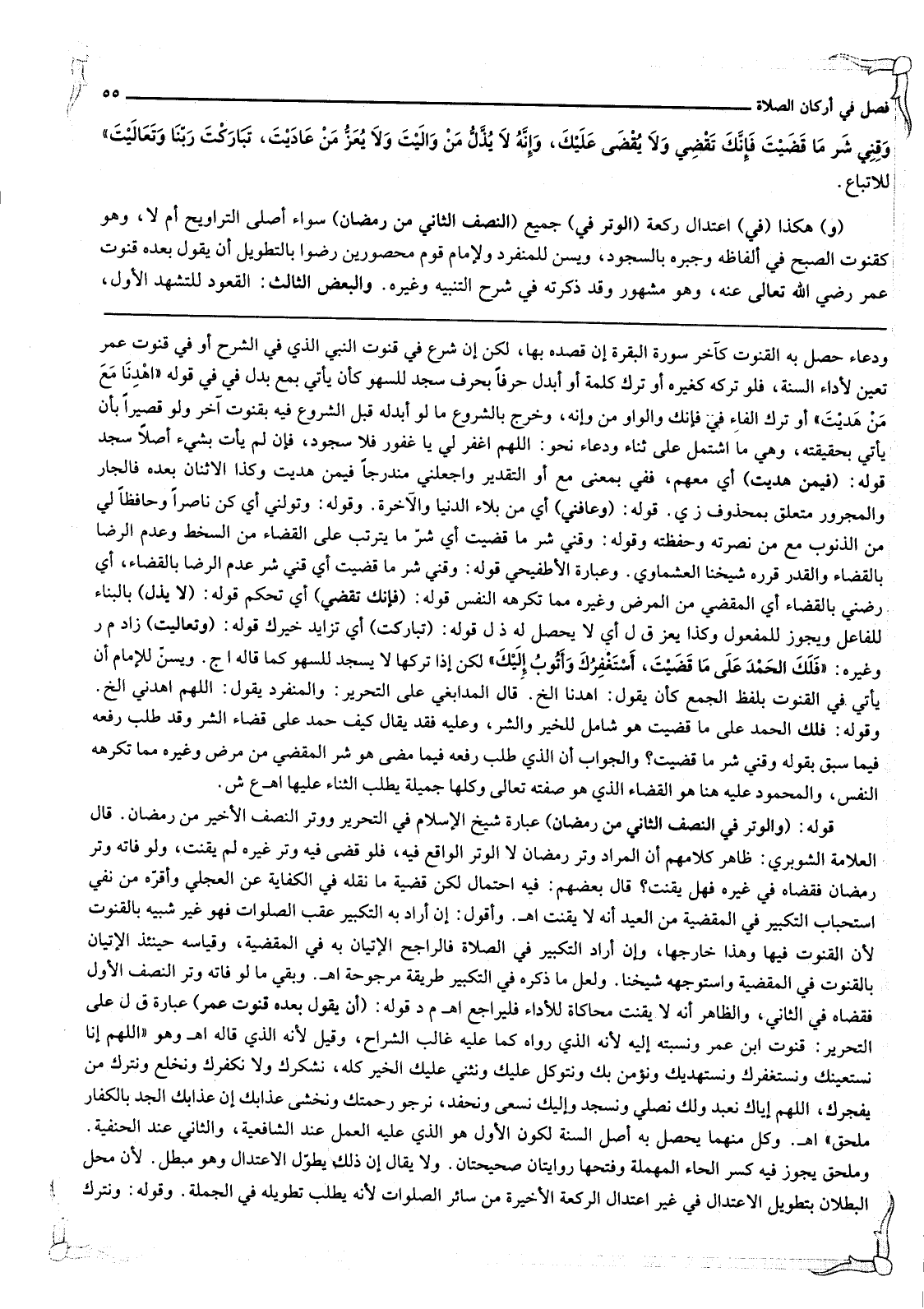 (وَ) هَكَذَا (فِي) اعْتِدَالِ رَكْعَةِ (الْوِتْرِ فِي) جَمِيعِ (النِّصْفِ الثَّانِي مِنْ رَمَضَانَ) سَوَاءٌ أَصَلَّى التَّرَاوِيحَ أَمْ لَا، وَهُوَ كَقُنُوتِ الصُّبْحِ فِي أَلْفَاظِهِ وَجَبْرِهِ بِالسُّجُودِ، وَيُسَنُّ لِلْمُنْفَرِدِ وَلِإِمَامِ قَوْمٍ مَحْصُورِينَ رَضُوا بِالتَّطْوِيلِ أَنْ يَقُولَ بَعْدَهُ قُنُوتَ عُمَرَ - رَضِيَ اللَّهُ تَعَالَى عَنْهُ -، وَهُوَ مَشْهُورٌ وَقَدْ ذَكَرْته فِي شَرْحِ التَّنْبِيهِ وَغَيْرِهِ. وَالْبَعْضُ الثَّالِثُ: الْقُعُودُ لِلتَّشَهُّدِ الْأَوَّلِ،