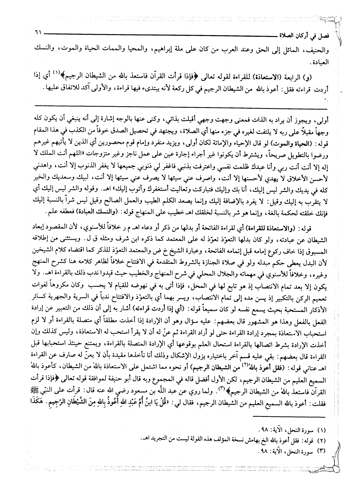 (وَ) الرَّابِعَةُ (الِاسْتِعَاذَةُ) لِلْقِرَاءَةِ لِقَوْلِهِ تَعَالَى {فَإِذَا قَرَأْتَ الْقُرْآنَ فَاسْتَعِذْ بِاللَّهِ مِنَ الشَّيْطَانِ الرَّجِيمِ} [النحل: 98] أَيْ إذَا أَرَدْت قِرَاءَتَهُ فَقُلْ: أَعُوذُ بِاَللَّهِ مِنْ الشَّيْطَانِ الرَّجِيمِ فِي كُلِّ رَكْعَةٍ لِأَنَّهُ يَبْتَدِئُ فِيهَا قِرَاءَةً، وَالْأُولَى آكَدُ لِلِاتِّفَاقِ عَلَيْهَا.