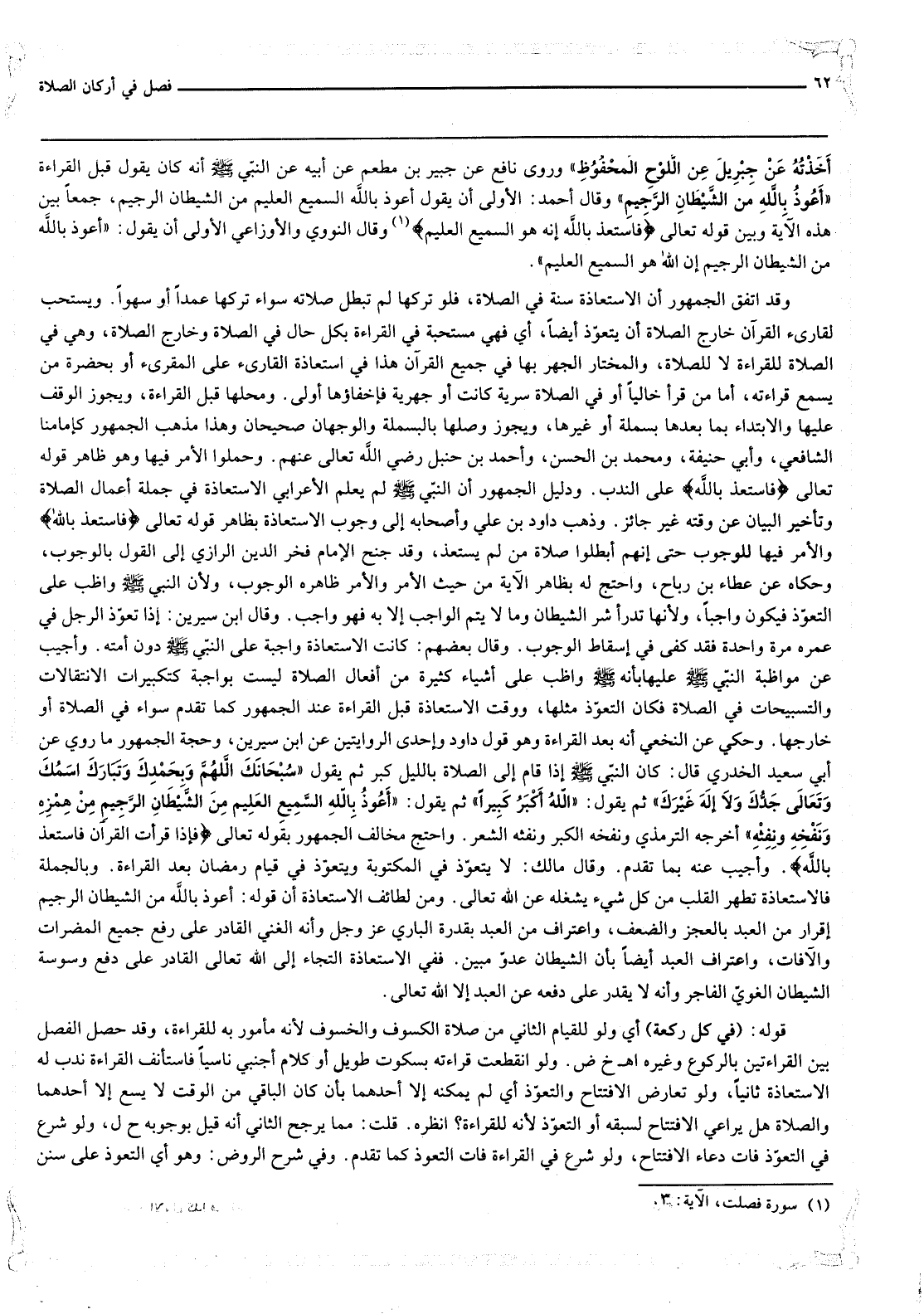 وَقَدْ اتَّفَقَ الْجُمْهُورُ أَنَّ الِاسْتِعَاذَةَ سُنَّةٌ فِي الصَّلَاةِ، فَلَوْ تَرَكَهَا لَمْ تَبْطُلْ صَلَاتُهُ سَوَاءٌ تَرَكَهَا عَمْدًا أَوْ سَهْوًا. وَيُسْتَحَبُّ لِقَارِئِ الْقُرْآنِ خَارِجَ الصَّلَاةِ أَنْ يَتَعَوَّذَ أَيْضًا، أَيْ فَهِيَ مُسْتَحَبَّةٌ فِي الْقِرَاءَةِ بِكُلِّ حَالٍ فِي الصَّلَاةِ وَخَارِجَ الصَّلَاةِ، وَهِيَ فِي الصَّلَاةِ لِلْقِرَاءَةِ لَا لِلصَّلَاةِ، وَالْمُخْتَارُ الْجَهْرُ بِهَا فِي جَمِيعِ الْقُرْآنِ هَذَا فِي اسْتِعَاذَةِ الْقَارِئِ عَلَى الْمُقْرِئِ أَوْ بِحَضْرَةِ مَنْ يَسْمَعُ قِرَاءَتَهُ، أَمَّا مَنْ قَرَأَ خَالِيًا أَوْ فِي الصَّلَاةِ سِرِّيَّةً كَانَتْ أَوْ جَهْرِيَّةً فَإِخْفَاؤُهَا أَوْلَى. وَمَحَلُّهَا قَبْلَ الْقِرَاءَةِ، وَيَجُوزُ الْوَقْفُ عَلَيْهَا وَالِابْتِدَاءُ بِمَا بَعْدَهَا بَسْمَلَةٌ أَوْ غَيْرُهَا، وَيَجُوزُ وَصْلُهَا بِالْبَسْمَلَةِ وَالْوَجْهَانِ صَحِيحَانِ وَهَذَا مَذْهَبُ الْجُمْهُورِ كَإِمَامِنَا الشَّافِعِيِّ، وَأَبِي حَنِيفَةَ، وَمُحَمَّدِ بْنِ الْحَسَنِ، وَأَحْمَدَ بْنِ حَنْبَلٍ - رَضِيَ اللَّهُ تَعَالَى عَنْهُمْ -. وَحَمَلُوا الْأَمْرَ فِيهَا وَهُوَ ظَاهِرٌ قَوْله تَعَالَى {فَاسْتَعِذْ بِاللَّهِ} [فصلت: 36] عَلَى النَّدْبِ. وَدَلِيلُ الْجُمْهُورِ أَنَّ النَّبِيَّ - صَلَّى اللَّهُ عَلَيْهِ وَسَلَّمَ - لَمْ يُعَلِّمْ الْأَعْرَابِيَّ الِاسْتِعَاذَةَ فِي جُمْلَةِ أَعْمَالِ الصَّلَاةِ وَتَأْخِيرُ الْبَيَانِ عَنْ وَقْتِهِ غَيْرُ جَائِزٍ. وَذَهَبَ دَاوُد بْنُ عَلِيٍّ وَأَصْحَابُهُ إلَى وُجُوبِ الِاسْتِعَاذَةِ بِظَاهِرِ قَوْله تَعَالَى {فَاسْتَعِذْ بِاللَّهِ} [فصلت: 36] وَالْأَمْرُ فِيهَا لِلْوُجُوبِ حَتَّى إنَّهُمْ أَبْطَلُوا صَلَاةَ مَنْ لَمْ يَسْتَعِذْ، وَقَدْ جَنَحَ الْإِمَامُ فَخْرُ الدِّينِ الرَّازِيّ إلَى الْقَوْلِ بِالْوُجُوبِ، وَحَكَاهُ عَنْ عَطَاءِ بْنِ رَبَاحٍ، وَاحْتَجَّ لَهُ بِظَاهِرِ الْآيَةِ مِنْ حَيْثُ الْأَمْرُ وَالْأَمْرُ ظَاهِرُهُ الْوُجُوبُ، وَلِأَنَّ النَّبِيَّ - صَلَّى اللَّهُ عَلَيْهِ وَسَلَّمَ - وَاظَبَ عَلَى التَّعَوُّذِ فَيَكُونُ وَاجِبًا، وَلِأَنَّهَا تَدْرَأُ شَرَّ الشَّيْطَانِ وَمَا لَا يَتِمُّ الْوَاجِبُ إلَّا بِهِ فَهُوَ وَاجِبٌ. وَقَالَ ابْنُ سِيرِينَ: إذَا تَعَوَّذَ الرَّجُلُ فِي عُمْرِهِ مَرَّةً وَاحِدَةً فَقَدْ كَفَى فِي إسْقَاطِ الْوُجُوبِ. وَقَالَ بَعْضُهُمْ: كَانَتْ الِاسْتِعَاذَةُ وَاجِبَةً عَلَى النَّبِيِّ - صَلَّى اللَّهُ عَلَيْهِ وَسَلَّمَ - دُونَ أُمَّتِهِ.