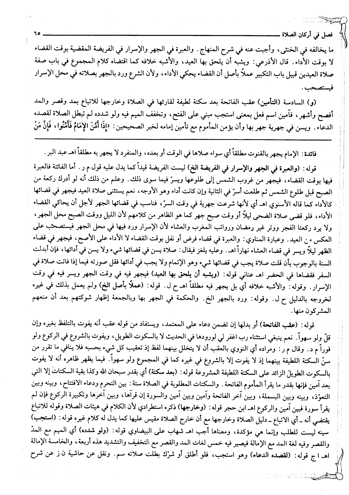 مَا يُخَالِفُهُ فِي الْخُنْثَى، وَأَجَبْت عَنْهُ فِي شَرْحِ الْمِنْهَاجِ. وَالْعِبْرَةُ فِي الْجَهْرِ وَالْإِسْرَارِ فِي الْفَرِيضَةِ الْمَقْضِيَّةِ بِوَقْتِ الْقَضَاءِ لَا بِوَقْتِ الْأَدَاءِ. قَالَ الْأَذْرَعِيُّ: وَيُشْبِهُ أَنْ يَلْحَقَ بِهَا الْعِيدُ، وَالْأَشْبَهُ خِلَافُهُ كَمَا اقْتَضَاهُ كَلَامُ الْمَجْمُوعِ فِي بَابِ صِفَةِ صَلَاةِ الْعِيدَيْنِ قُبَيْلَ بَابِ التَّكْبِيرِ عَمَلًا بِأَصْلِ أَنَّ الْقَضَاءَ يَحْكِي الْأَدَاءَ، وَلِأَنَّ الشَّرْعَ وَرَدَ بِالْجَهْرِ بِصَلَاتِهِ فِي مَحَلِّ الْإِسْرَارِ فَيُسْتَصْحَبُ.