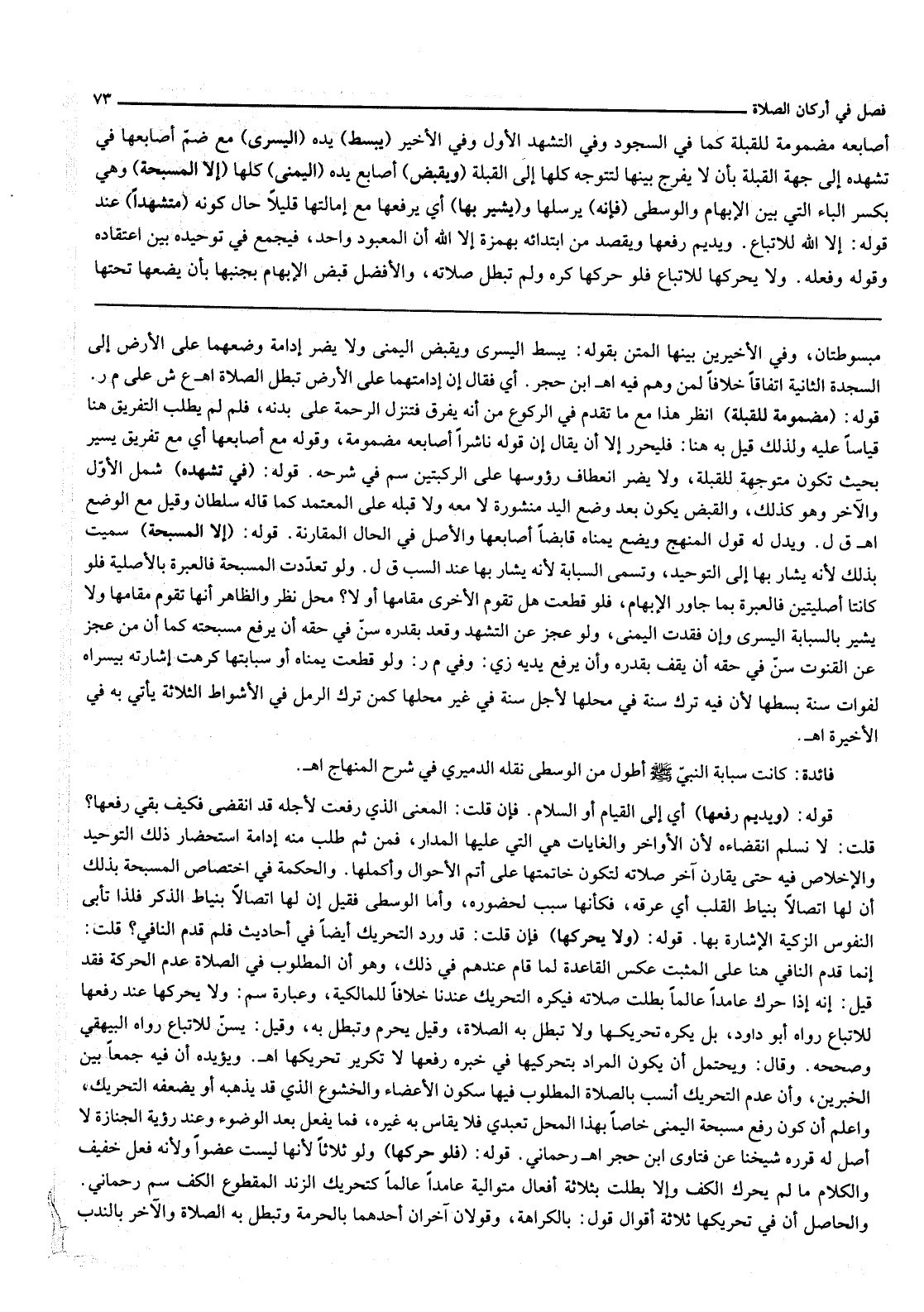 أَصَابِعَهُ مَضْمُومَةً لِلْقِبْلَةِ كَمَا فِي السُّجُودِ، وَفِي التَّشَهُّدِ الْأَوَّلِ وَفِي الْأَخِيرِ (يَبْسُطُ) يَدَهُ (الْيُسْرَى) مَعَ ضَمِّ أَصَابِعِهَا فِي تَشَهُّدِهِ إلَى جِهَةِ الْقِبْلَةِ بِأَنْ لَا يَفْرِجَ بَيْنَهَا لِتَتَوَجَّهَ كُلُّهَا إلَى الْقِبْلَةِ (وَيَقْبِضُ) أَصَابِعَ يَدِهِ (الْيُمْنَى) كُلَّهَا (إلَّا الْمُسَبِّحَةِ) وَهِيَ بِكَسْرِ الْبَاءِ الَّتِي بَيْنَ الْإِبْهَامِ وَالْوُسْطَى (فَإِنَّهُ) يُرْسِلُهَا وَ (يُشِيرُ بِهَا) أَيْ يَرْفَعُهَا مَعَ إمَالَتِهَا قَلِيلًا حَالَ كَوْنِهِ (مُتَشَهِّدًا) عِنْدَ قَوْلِهِ: إلَّا اللَّهُ لِلِاتِّبَاعِ. وَيُدِيمُ رَفْعَهَا وَيَقْصِدُ مِنْ ابْتِدَائِهِ بِهَمْزَةِ إلَّا اللَّهُ أَنَّ الْمَعْبُودَ وَاحِدٌ، فَيَجْمَعُ فِي تَوْحِيدِهِ بَيْنَ اعْتِقَادِهِ وَقَوْلِهِ وَفِعْلِهِ. وَلَا يُحَرِّكُهَا لِلِاتِّبَاعِ فَلَوْ حَرَّكَهَا كُرِهَ وَلَمْ تَبْطُلْ صَلَاتُهُ، وَالْأَفْضَلُ قَبْضُ الْإِبْهَامِ بِجَنْبِهَا بِأَنْ يَضَعَهَا تَحْتَهَا