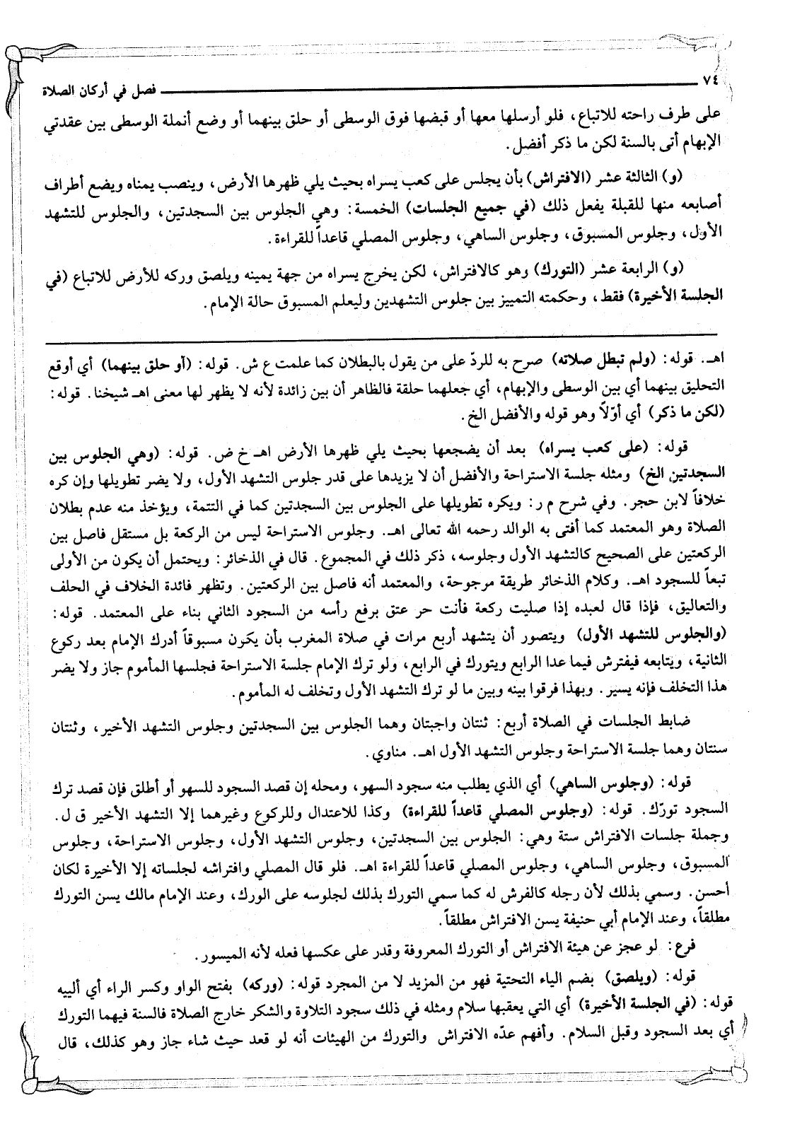 (وَ) الرَّابِعَةَ عَشَرَ (التَّوَرُّكُ) وَهُوَ كَالِافْتِرَاشِ، لَكِنْ يُخْرِجُ يُسْرَاهُ مِنْ جِهَةِ يَمِينِهِ وَيُلْصِقُ وَرِكَهُ لِلْأَرْضِ لِلِاتِّبَاعِ (فِي الْجِلْسَةِ الْأَخِيرَةِ) فَقَطْ، وَحِكْمَتُهُ التَّمْيِيزُ بَيْنَ جُلُوسِ التَّشَهُّدَيْنِ وَلِيَعْلَمَ الْمَسْبُوقُ حَالَةَ الْإِمَامِ.