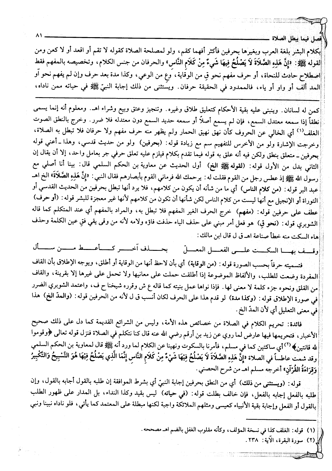 بِكَلَامِ الْبَشَرِ بِلُغَةِ الْعَرَبِ وَبِغَيْرِهَا بِحَرْفَيْنِ فَأَكْثَرَ أَفْهَمَا كَقُمْ، وَلَوْ لِمَصْلَحَةِ الصَّلَاةِ كَقَوْلِهِ لَا تَقُمْ أَوْ اُقْعُدْ أَوْ لَا كَعَنْ وَمِنْ لِقَوْلِهِ - صَلَّى اللَّهُ عَلَيْهِ وَسَلَّمَ -: «إنَّ هَذِهِ الصَّلَاةَ لَا يَصْلُحُ فِيهَا شَيْءٌ مِنْ كَلَامِ النَّاسِ» وَالْحَرْفَانِ مِنْ جِنْسِ الْكَلَامِ، وَتَخْصِيصُهُ بِالْمُفْهِمِ فَقَطْ اصْطِلَاحٌ حَادِثٌ لِلنُّحَاةِ، أَوْ حَرْفٌ مُفْهِمٌ نَحْوَ قِ مِنْ الْوِقَايَةِ، وَعِ مِنْ الْوَعْيِ، وَكَذَا مَدَّةٌ بَعْدَ حَرْفٍ وَإِنْ لَمْ يُفْهِمْ نَحْوُ آو الْمَدُّ أَلِفًا أَوْ وَاوًا أَوْ يَاءً، فَالْمَمْدُودُ فِي الْحَقِيقَةِ حَرْفَانِ. وَيُسْتَثْنَى مِنْ ذَلِكَ إجَابَةُ النَّبِيِّ - صَلَّى اللَّهُ عَلَيْهِ وَسَلَّمَ - فِي حَيَاتِهِ مِمَّنْ نَادَاهُ،
