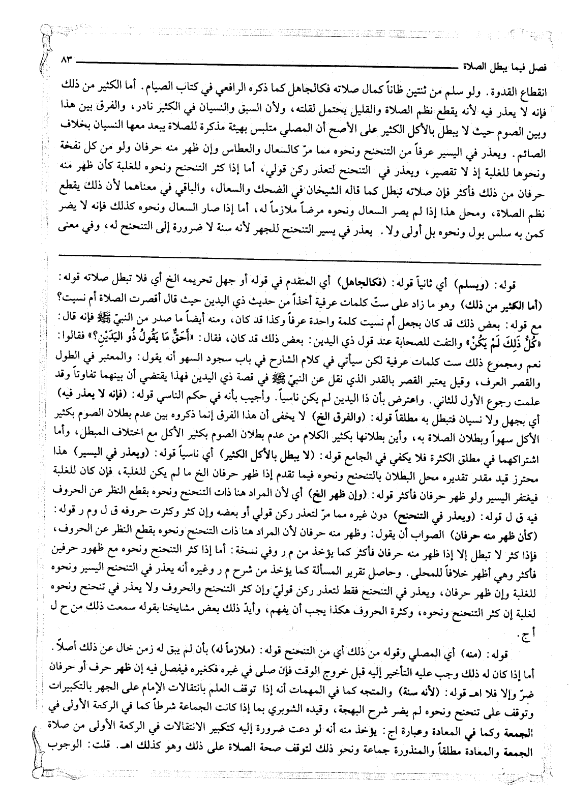انْقِطَاعِ الْقُدْوَةِ. وَلَوْ سَلَّمَ مِنْ ثِنْتَيْنِ ظَانًّا كَمَالَ صَلَاتِهِ فَكَالْجَاهِلِ كَمَا ذَكَرَهُ الرَّافِعِيُّ فِي كِتَابِ الصِّيَامِ. أَمَّا الْكَثِيرُ مِنْ ذَلِكَ فَإِنَّهُ لَا يُعْذَرُ فِيهِ لِأَنَّهُ يَقْطَعُ نَظْمَ الصَّلَاةِ وَالْقَلِيلُ يُحْتَمَلُ لِقِلَّتِهِ، وَلِأَنَّ السَّبْقَ وَالنِّسْيَانَ فِي الْكَثِيرِ نَادِرٌ، وَالْفَرْقُ بَيْنَ هَذَا وَبَيْنَ الصَّوْمِ حَيْثُ لَا يَبْطُلُ بِالْأَكْلِ الْكَثِيرِ عَلَى الْأَصَحِّ أَنَّ الْمُصَلِّيَ مُتَلَبِّسٌ بِهَيْئَةٍ مُذَكَّرَةٍ لِلصَّلَاةِ يَبْعُدُ مَعَهَا النِّسْيَانُ بِخِلَافِ الصَّائِمِ. وَيُعْذَرُ فِي الْيَسِيرِ عُرْفًا مِنْ التَّنَحْنُحِ وَنَحْوِهِ مِمَّا مَرَّ كَالسُّعَالِ وَالْعُطَاسِ وَإِنْ ظَهَرَ مِنْهُ حَرْفَانِ وَلَوْ مِنْ كُلِّ نَفْخَةٍ وَنَحْوِهَا لِلْغَلَبَةِ إذْ لَا تَقْصِيرَ، وَيُعْذَرُ فِي التَّنَحْنُحِ لِتَعَذُّرِ رُكْنٍ قَوْلِيٍّ، أَمَّا إذَا كَثُرَ التَّنَحْنُحُ وَنَحْوُهُ لِلْغَلَبَةِ كَأَنْ ظَهَرَ مِنْهُ حَرْفَانِ مِنْ ذَلِكَ فَأَكْثَرَ فَإِنَّ صَلَاتَهُ تَبْطُلُ كَمَا قَالَهُ الشَّيْخَانِ فِي الضَّحِكِ وَالسُّعَالِ، وَالْبَاقِي فِي مَعْنَاهُمَا لِأَنَّ ذَلِكَ يَقْطَعُ نَظْمَ الصَّلَاةِ، وَمَحَلُّ هَذَا إذَا لَمْ يَصِرْ السُّعَالُ وَنَحْوُهُ مَرَضًا مُلَازِمًا لَهُ، أَمَّا إذَا صَارَ السُّعَالُ وَنَحْوُهُ كَذَلِكَ فَإِنَّهُ لَا يَضُرُّ كَمَنْ بِهِ سَلَسُ بَوْلٍ وَنَحْوُهُ بَلْ أَوْلَى وَلَا. يُعْذَرُ فِي يَسِيرِ التَّنَحْنُحِ لِلْجَهْرِ لِأَنَّهُ سُنَّةٌ لَا ضَرُورَةَ إلَى التَّنَحْنُحِ لَهُ، وَفِي مَعْنَى