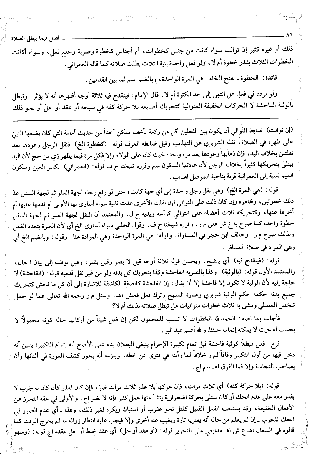 ذَلِكَ أَوْ غَيْرِهِ كَثِيرٌ إنْ تَوَالَتْ سَوَاءٌ كَانَتْ مِنْ جِنْسٍ كَخُطُوَاتٍ، أَمْ أَجْنَاسٍ كَخُطْوَةٍ وَضَرْبَةٍ وَخَلْعِ نَعْلٍ، وَسَوَاءٌ أَكَانَتْ الْخُطُوَاتُ الثَّلَاثُ بِقَدْرِ خُطْوَةٍ أَمْ لَا، وَلَوْ فَعَلَ وَاحِدَةً بِنِيَّةِ الثَّلَاثِ بَطَلَتْ صَلَاتُهُ كَمَا قَالَهُ الْعُمْرَانِيُّ. فَائِدَةٌ الْخَطْوَةُ بِفَتْحِ الْخَاءِ هِيَ الْمَرَّةُ الْوَاحِدَةُ وَبِالضَّمِّ اسْمٌ لِمَا بَيْنَ الْقَدَمَيْنِ.