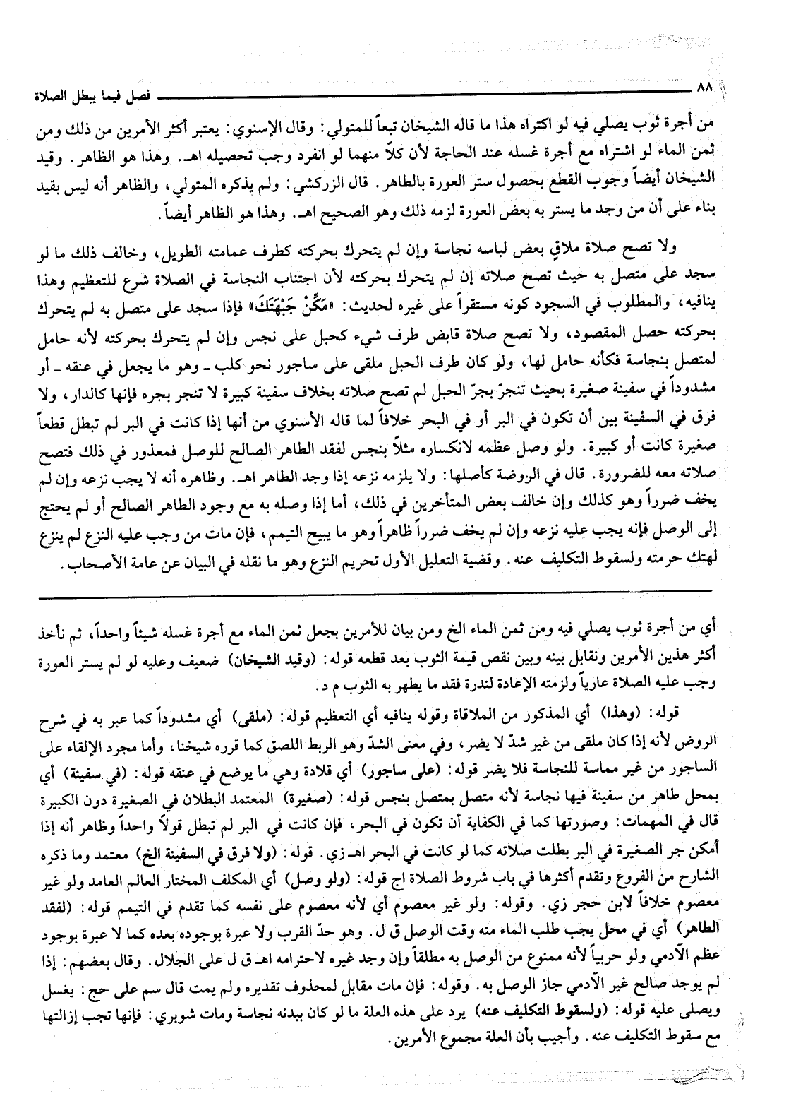 وَلَا تَصِحُّ صَلَاةُ مُلَاقٍ بَعْضَ لِبَاسِهِ نَجَاسَةً وَإِنْ لَمْ يَتَحَرَّكْ بِحَرَكَتِهِ كَطَرَفِ عِمَامَتِهِ الطَّوِيلِ، وَخَالَفَ ذَلِكَ مَا لَوْ سَجَدَ عَلَى مُتَّصِلٍ بِهِ حَيْثُ تَصِحُّ صَلَاتُهُ إنْ لَمْ يَتَحَرَّكْ بِحَرَكَتِهِ لِأَنَّ اجْتِنَابَ النَّجَاسَةِ فِي الصَّلَاةِ شُرِعَ لِلتَّعْظِيمِ وَهَذَا يُنَافِيهِ، وَالْمَطْلُوبُ فِي السُّجُودِ كَوْنُهُ مُسْتَقِرًّا عَلَى غَيْرِهِ لِحَدِيثِ: «مَكِّنْ جَبْهَتَك» فَإِذَا سَجَدَ عَلَى مُتَّصِلٍ بِهِ لَمْ يَتَحَرَّكْ بِحَرَكَتِهِ حَصَلَ الْمَقْصُودُ، وَلَا تَصِحُّ صَلَاةُ قَابِضِ طَرَفِ شَيْءٍ كَحَبْلٍ عَلَى نَجَسٍ وَإِنْ لَمْ يَتَحَرَّكْ بِحَرَكَتِهِ لِأَنَّهُ حَامِلٌ لِمُتَّصِلٍ بِنَجَاسَةٍ فَكَأَنَّهُ حَامِلٌ لَهَا، وَلَوْ كَانَ طَرَفُ الْحَبْلِ مُلْقًى عَلَى سَاجُورِ نَحْوِ كَلْبٍ وَهُوَ مَا يُجْعَلُ فِي عُنُقِهِ أَوْ مَشْدُودًا فِي سَفِينَةٍ صَغِيرَةٍ بِحَيْثُ تَنْجَرُّ بِجَرِّ الْحَبْلِ لَمْ تَصِحَّ صَلَاتُهُ بِخِلَافِ سَفِينَةٍ كَبِيرَةٍ لَا تَنْجَرُّ بِجَرِّهِ فَإِنَّهَا كَالدَّارِ، وَلَا فَرْقَ فِي السَّفِينَةِ بَيْنَ أَنْ تَكُونَ فِي الْبَرِّ أَوْ فِي الْبَحْرِ خِلَافًا لِمَا قَالَهُ الْإِسْنَوِيُّ مِنْ أَنَّهَا إذَا كَانَتْ فِي الْبَرِّ لَمْ تَبْطُلْ قَطْعًا صَغِيرَةً كَانَتْ أَوْ كَبِيرَةً. وَلَوْ وَصَلَ عَظْمَهُ لِانْكِسَارِهِ مَثَلًا بِنَجَسٍ لِفَقْدِ الطَّاهِرِ الصَّالِحِ لِلْوَصْلِ فَمَعْذُورٌ فِي ذَلِكَ فَتَصِحُّ صَلَاتُهُ مَعَهُ لِلضَّرُورَةِ. قَالَ فِي الرَّوْضَةِ كَأَصْلِهَا: وَلَا يَلْزَمُهُ نَزْعُهُ إذَا وُجِدَ الطَّاهِرُ اهـ: وَظَاهِرُهُ أَنَّهُ لَا يَجِبُ نَزْعُهُ وَإِنْ لَمْ يَخَفْ ضَرَرًا وَهُوَ كَذَلِكَ وَإِنْ خَالَفَ بَعْضُ الْمُتَأَخِّرِينَ فِي ذَلِكَ، أَمَّا إذَا وَصَلَهُ بِهِ مَعَ وُجُودِ الطَّاهِرِ الصَّالِحِ أَوْ لَمْ يَحْتَجْ إلَى الْوَصْلِ فَإِنَّهُ يَجِبُ عَلَيْهِ نَزْعُهُ وَإِنْ لَمْ يَخَفْ ضَرَرًا ظَاهِرًا وَهُوَ مَا يُبِيحُ التَّيَمُّمَ، فَإِنْ مَاتَ مَنْ وَجَبَ عَلَيْهِ النَّزْعُ لَمْ يَنْزِعْ لِهَتْكِ حُرْمَتِهِ وَلِسُقُوطِ التَّكْلِيفِ عَنْهُ. وَقَضِيَّةُ التَّعْلِيلِ الْأَوَّلِ تَحْرِيمُ النَّزْعِ وَهُوَ مَا نَقَلَهُ فِي الْبَيَانِ عَنْ عَامَّةِ الْأَصْحَابِ.
