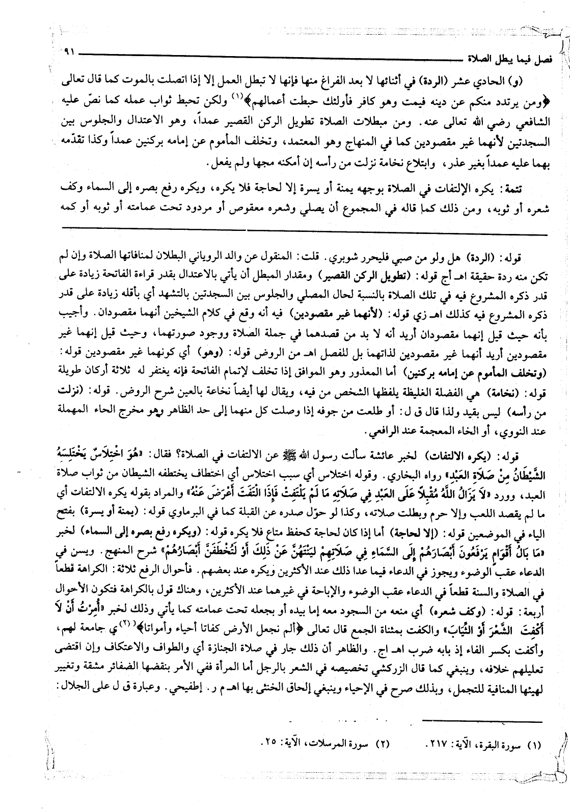 ـــــــــــــــــــــــــــــQقَوْلُهُ: (الرِّدَّةُ) هَلْ وَلَوْ مِنْ صَبِيٍّ فَلْيُحَرَّرْ شَوْبَرِيُّ. قُلْت: الْمَنْقُولُ عَنْ وَالِدِ الرُّويَانِيِّ الْبُطْلَانُ لِمُنَافَاتِهَا الصَّلَاةَ وَإِنْ لَمْ تَكُنْ مِنْهُ رِدَّةٌ حَقِيقَةً اهـ أج قَوْلُهُ: (تَطْوِيلُ الرُّكْنِ الْقَصِيرِ) وَمِقْدَارُ الْمُبْطِلِ أَنْ يَأْتِيَ بِالِاعْتِدَالِ بِقَدْرِ قِرَاءَةِ الْفَاتِحَةِ زِيَادَةً عَلَى قَدْرِ ذِكْرِهِ الْمَشْرُوعِ فِيهِ فِي تِلْكَ الصَّلَاةِ بِالنِّسْبَةِ لِحَالِ الْمُصَلِّي وَالْجُلُوسُ بَيْنَ السَّجْدَتَيْنِ بِالتَّشَهُّدِ أَيْ بِأَقَلِّهِ زِيَادَةً عَلَى قَدْرِ ذِكْرِهِ الْمَشْرُوعِ فِيهِ كَذَلِكَ. اهـ. ز ي قَوْلُهُ: (لِأَنَّهُمَا غَيْرُ مَقْصُودَيْنِ) فِيهِ أَنَّهُ وَقَعَ فِي كَلَامِ الشَّيْخَيْنِ أَنَّهُمَا مَقْصُودَانِ. وَأُجِيبَ بِأَنَّهُ حَيْثُ قِيلَ إنَّهُمَا مَقْصُودَانِ أُرِيدَ أَنَّهُ لَا بُدَّ مِنْ قَصْدِهِمَا فِي جُمْلَةِ الصَّلَاةِ وَوُجُودِ صُورَتِهِمَا، وَحَيْثُ قِيلَ إنَّهُمَا غَيْرُ مَقْصُودَيْنِ أُرِيدَ أَنَّهُمَا غَيْرُ مَقْصُودَيْنِ لِذَاتِهِمَا بَلْ لِلْفَصْلِ اهـ مِنْ الرَّوْضِ قَوْلُهُ: (وَهُوَ) أَيْ كَوْنُهُمَا غَيْرَ مَقْصُودَيْنِ قَوْلُهُ: (وَتَخَلَّفَ الْمَأْمُومُ عَنْ إمَامِهِ بِرُكْنَيْنِ) أَمَّا الْمَعْذُورُ وَهُوَ الْمُوَافِقُ إذَا تَخَلَّفَ لِإِتْمَامِ الْفَاتِحَةِ فَإِنَّهُ يُغْتَفَرُ لَهُ ثَلَاثَةُ أَرْكَانٍ طَوِيلَةٍ قَوْلُهُ: (نُخَامَةٌ) هِيَ الْفَضْلَةُ الْغَلِيظَةُ يَلْفِظُهَا الشَّخْصُ مِنْ فِيهِ وَيُقَالُ لَهَا أَيْضًا نُخَاعَةٌ بِالْعَيْنِ شَرْحُ الرَّوْضِ.