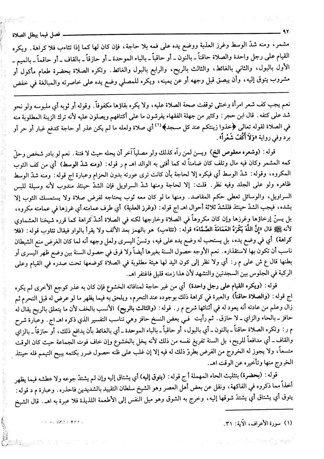 قَوْلُهُ: (وَيُكْرَهُ الْقِيَامُ عَلَى رِجْلٍ وَاحِدَةٍ) أَيْ مِنْ غَيْرِ حَاجَةٍ لِمُنَافَاتِهِ الْخُشُوعَ فَإِنْ كَانَ بِهِ عُذْرٌ كَوَجَعِ الْأُخْرَى لَمْ يُكْرَهْ اج قَوْلُهُ: (وَالصَّلَاةُ حَاقِنًا) وَالْعِبْرَةُ فِي كَرَاهَةِ ذَلِكَ بِوُجُودِهِ عِنْدَ التَّحَرُّمِ، وَيَلْحَقُ بِهِ فِيمَا يَظْهَرُ مَا لَوْ عَرَضَ لَهُ قَبْلَ التَّحَرُّمِ ثُمَّ زَالَ وَعُلِمَ مِنْ عَادَتِهِ أَنَّهُ يَعُودُ لَهُ فِي أَثْنَائِهَا شَرْحُ م ر.