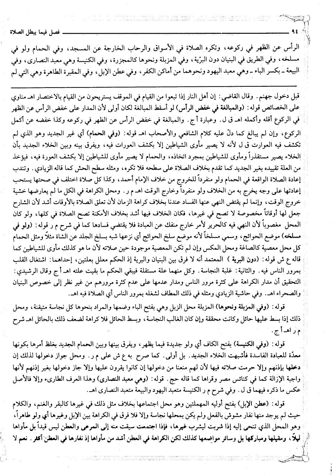 وَتُكْرَهُ الصَّلَاةُ فِي الْأَسْوَاقِ وَالرِّحَابِ الْخَارِجَةِ عَنْ الْمَسْجِدِ، وَفِي الْحَمَّامِ وَلَوْ فِي مَسْلَخِهِ، وَفِي الطَّرِيقِ فِي الْبُنْيَانِ دُونَ الْبَرِّيَّةِ، وَفِي الْمَزْبَلَةِ وَنَحْوِهَا كَالْمَجْزَرَةِ، وَفِي الْكَنِيسَةِ وَهِيَ مَعْبَدُ النَّصَارَى، وَفِي الْبِيعَةِ بِكَسْرِ الْبَاءِ وَهِيَ مَعْبَدُ الْيَهُودِ وَنَحْوِهِمَا مِنْ أَمَاكِنِ الْكُفْرِ، وَفِي عَطَنِ الْإِبِلِ، وَفِي الْمَقْبَرَةِ الطَّاهِرَةِ وَهِيَ الَّتِي لَمْ