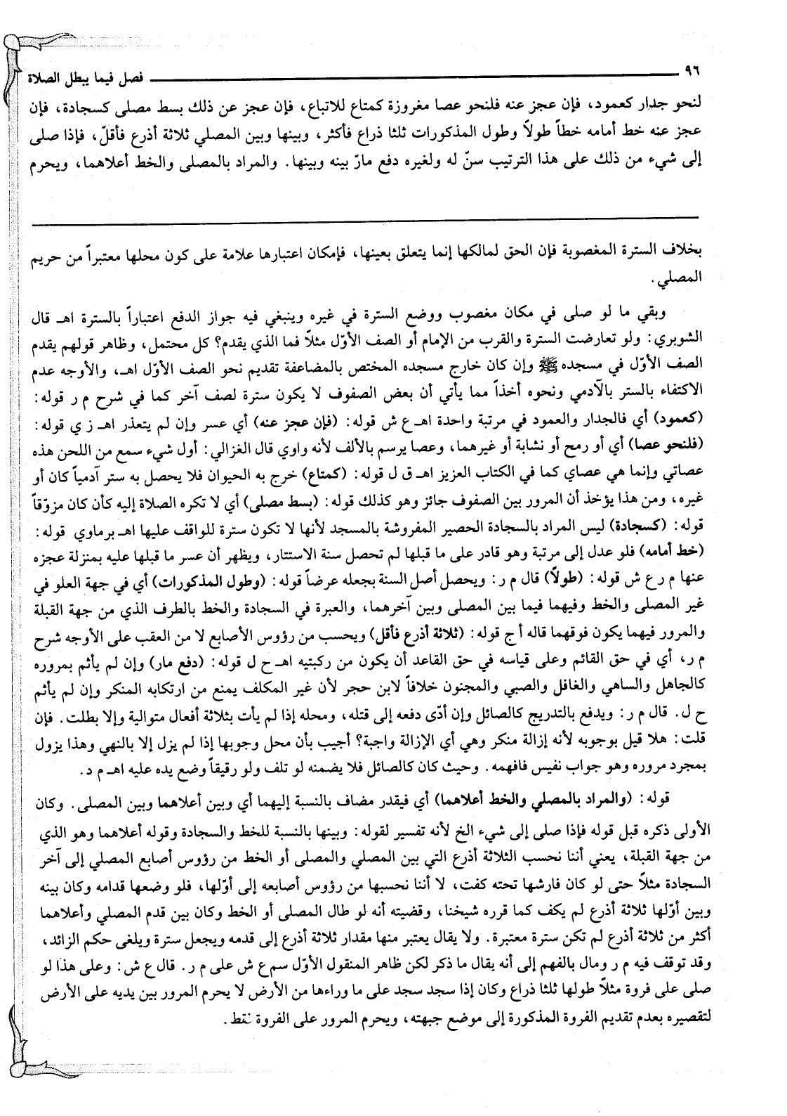 وَبَقِيَ مَا لَوْ صَلَّى فِي مَكَان مَغْصُوبٍ وَوَضَعَ السُّتْرَةَ فِي غَيْرِهِ وَيَنْبَغِي فِيهِ جَوَازُ الدَّفْعِ اعْتِبَارًا بِالسُّتْرَةِ اهـ قَالَ الشَّوْبَرِيُّ: وَلَوْ تَعَارَضَتْ السُّتْرَةُ وَالْقُرْبُ مِنْ الْإِمَامِ أَوْ الصَّفِّ الْأَوَّلِ مَثَلًا فَمَا الَّذِي يُقَدَّمُ؟ كُلٌّ مُحْتَمَلٌ، وَظَاهِرُ قَوْلِهِمْ يُقَدَّمُ الصَّفُّ الْأَوَّلُ فِي مَسْجِدِهِ - صَلَّى اللَّهُ عَلَيْهِ وَسَلَّمَ - وَإِنْ كَانَ خَارِجَ مَسْجِدِهِ الْمُخْتَصِّ بِالْمُضَاعَفَةِ تَقْدِيمُ نَحْوِ الصَّفِّ الْأَوَّلِ اهـ، وَالْأَوْجَهُ عَدَمُ الِاكْتِفَاءِ بِالسِّتْرِ بِالْآدَمِيِّ وَنَحْوِهِ أَخْذًا مِمَّا يَأْتِي أَنَّ بَعْضَ الصُّفُوفِ لَا يَكُونُ سُتْرَةً لِصَفٍّ آخَرَ كَمَا فِي شَرْحِ م ر قَوْلُهُ: (كَعَمُودٍ) أَيْ فَالْجِدَارُ وَالْعَمُودُ فِي مَرْتَبَةٍ وَاحِدَةٍ. اهـ. ع ش قَوْلُهُ: (فَإِنْ عَجَزَ عَنْهُ) أَيْ عَسُرَ وَإِنْ لَمْ يَتَعَذَّرْ. اهـ. ز ي قَوْلُهُ: (فَلِنَحْوِ عَصَا) أَيْ أَوْ رُمْحٍ أَوْ نُشَّابَةٍ أَوْ غَيْرِهِمَا، وَعَصَا يُرْسَمُ بِالْأَلِفِ لِأَنَّهُ وَاوِيٌّ قَالَ الْغَزَالِيُّ: أَوَّلُ شَيْءٍ سُمِعَ مِنْ اللَّحْنِ هَذِهِ عَصَاتِي وَإِنَّمَا هِيَ عَصَايَ كَمَا فِي الْكِتَابِ الْعَزِيزِ. اهـ. ق ل قَوْلُهُ: (كَمَتَاعٍ) خَرَجَ بِهِ الْحَيَوَانُ فَلَا يَحْصُلُ بِهِ سِتْرٌ آدَمِيًّا كَانَ أَوْ غَيْرَهُ، وَمِنْ هَذَا يُؤْخَذُ أَنَّ الْمُرُورَ بَيْنَ الصُّفُوفِ جَائِزٌ وَهُوَ كَذَلِكَ قَوْلُهُ: (بَسَطَ مُصَلًّى) أَيْ لَا تُكْرَهُ الصَّلَاةُ إلَيْهِ كَأَنْ كَانَ مُزَوَّقًا قَوْلُهُ: (كَسَجَّادَةٍ) لَيْسَ الْمُرَادُ بِالسَّجَّادَةِ الْحَصِيرَ الْمَفْرُوشَةَ بِالْمَسْجِدِ لِأَنَّهَا لَا تَكُونُ سُتْرَةً لِلْوَاقِفِ عَلَيْهَا. اهـ. بِرْمَاوِيٌّ قَوْلُهُ: (خَطَّ أَمَامَهُ) فَلَوْ عَدَلَ إلَى مَرْتَبَةٍ وَهُوَ قَادِرٌ عَلَى مَا قَبْلَهَا لَمْ تَحْصُلْ سُنَّةُ الِاسْتِتَارِ، وَيَظْهَرُ أَنَّ عُسْرَ مَا قَبْلَهَا عَلَيْهِ بِمَنْزِلَةِ عَجْزِهِ عَنْهَا م ر ع ش قَوْلُهُ: (طُولًا) قَالَ م ر: وَيَحْصُلُ أَصْلُ السُّنَّةِ بِجَعْلِهِ عَرْضًا قَوْلُهُ: (وَطُولُ الْمَذْكُورَاتِ) أَيْ فِي جِهَةِ الْعُلُوِّ فِي غَيْرِ الْمُصَلَّى وَالْخَطُّ وَفِيهِمَا فِيمَا بَيْنَ الْمُصَلَّى وَبَيْنَ آخِرِهِمَا، وَالْعِبْرَةُ فِي السَّجَّادَةِ وَالْخَطِّ بِالطَّرَفِ الَّذِي مِنْ جِهَةِ الْقِبْلَةِ وَالْمُرُورُ فِيهِمَا يَكُونُ فَوْقَهُمَا قَالَهُ أج قَوْلُهُ: (ثَلَاثَةُ أَذْرُعٍ فَأَقَلُّ) وَيُحْسَبُ مِنْ رُءُوسِ الْأَصَابِعِ لَا مِنْ الْعَقِبِ عَلَى الْأَوْجَهِ شَرْحُ م ر، أَيْ فِي حَقِّ الْقَائِمِ وَعَلَى قِيَاسِهِ فِي حَقِّ الْقَاعِدِ أَنْ يَكُونَ مِنْ رُكْبَتَيْهِ اهـ ح ل قَوْلُهُ: (دَفْعُ مَارٍّ) وَإِنْ لَمْ يَأْثَمْ بِمُرُورِهِ كَالْجَاهِلِ وَالسَّاهِي وَالْغَافِلِ وَالصَّبِيِّ وَالْمَجْنُونِ خِلَافًا لِابْنِ حَجَرٍ لِأَنَّ غَيْرَ الْمُكَلَّفِ يُمْنَعُ مِنْ ارْتِكَابِهِ الْمُنْكَرَ وَإِنْ لَمْ يَأْثَمْ ح ل. قَالَ م ر: وَيَدْفَعُ بِالتَّدْرِيجِ كَالصَّائِلِ وَإِنْ أَدَّى دَفْعُهُ إلَى قَتْلِهِ، وَمَحَلُّهُ إذَا لَمْ يَأْتِ بِثَلَاثَةِ أَفْعَالٍ مُتَوَالِيَةٍ وَإِلَّا بَطَلَتْ. فَإِنْ قُلْتَ: هَلَّا قِيلَ بِوُجُوبِهِ لِأَنَّهُ إزَالَةُ مُنْكَرٍ وَهُوَ أَيْ الْإِزَالَةُ وَاجِبَةٌ؟ أُجِيبَ بِأَنَّ مَحَلَّ وُجُوبِهَا إذَا لَمْ يَزُلْ إلَّا بِالنَّهْيِ وَهَذَا يَزُولُ بِمُجَرَّدِ مُرُورِهِ وَهُوَ جَوَابٌ نَفِيسٌ فَافْهَمْهُ. وَحَيْثُ كَانَ كَالصَّائِلِ فَلَا يَضْمَنُهُ لَوْ تَلِفَ وَلَوْ رَقِيقًا وَضَعَ يَدَهُ عَلَيْهِ. اهـ. م د.