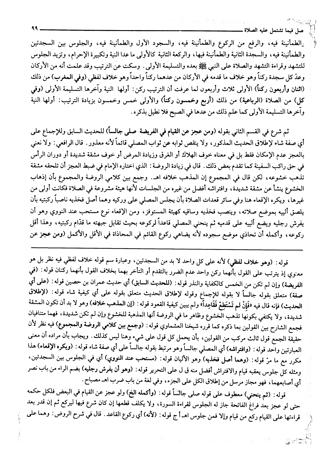 ثُمَّ شَرَعَ فِي الْقِسْمِ الثَّانِي بِقَوْلِهِ (وَمَنْ عَجَزَ عَنْ الْقِيَامِ فِي الْفَرِيضَةِ صَلَّى جَالِسًا) لِلْحَدِيثِ السَّابِقِ وَلِلْإِجْمَاعِ عَلَى أَيِّ صِفَةٍ شَاءَ لِإِطْلَاقِ الْحَدِيثِ الْمَذْكُورِ، وَلَا يَنْقُصُ ثَوَابُهُ عَنْ ثَوَابِ الْمُصَلِّي قَائِمًا لِأَنَّهُ مَعْذُورٌ. قَالَ الرَّافِعِيُّ: وَلَا نَعْنِي بِالْعَجْزِ عَدَمَ الْإِمْكَانِ فَقَطْ بَلْ فِي مَعْنَاهُ خَوْفُ الْهَلَاكِ أَوْ الْغَرَقِ وَزِيَادَةِ الْمَرَضِ أَوْ خَوْفُ مَشَقَّةٍ شَدِيدَةٍ أَوْ دَوَرَانُ الرَّأْسِ فِي حَقِّ رَاكِبِ السَّفِينَةِ كَمَا تَقَدَّمَ بَعْضُ ذَلِكَ. قَالَ فِي زِيَادَةِ الرَّوْضَةِ: الَّذِي اخْتَارَهُ الْإِمَامُ فِي ضَبْطِ الْعَجْزِ أَنْ تَلْحَقَهُ مَشَقَّةٌ تُذْهِبُ خُشُوعَهُ، لَكِنْ قَالَ فِي الْمَجْمُوعِ إنَّ الْمَذْهَبَ خِلَافُهُ اهـ. وَجَمَعَ بَيْنَ كَلَامَيْ الرَّوْضَةِ وَالْمَجْمُوعِ بِأَنَّ إذْهَابَ الْخُشُوعِ يَنْشَأُ عَنْ مَشَقَّةٍ شَدِيدَةٍ، وَافْتِرَاشُهُ أَفْضَلُ مِنْ غَيْرِهِ مِنْ الْجِلْسَاتِ لِأَنَّهَا هَيْئَةٌ مَشْرُوعَةٌ فِي الصَّلَاةِ فَكَانَتْ أَوْلَى مِنْ غَيْرِهَا، وَيُكْرَهُ الْإِقْعَاءُ هُنَا وَفِي سَائِرِ قَعَدَاتِ الصَّلَاةِ بِأَنْ يَجْلِسَ الْمُصَلِّي عَلَى وَرِكَيْهِ وَهُمَا أَصْلُ فَخِذَيْهِ نَاصِبًا رُكْبَتَيْهِ بِأَنْ يُلْصِقَ أَلْيَيْهِ بِمَوْضِعِ صَلَاتِهِ، وَيَنْصِبَ فَخِذَيْهِ وَسَاقَيْهِ كَهَيْئَةِ الْمُسْتَوْفِزِ، وَمِنْ الْإِقْعَاءِ نَوْعٌ مُسْتَحَبٌّ عِنْدَ النَّوَوِيِّ وَهُوَ أَنْ يَفْرِشَ رِجْلَيْهِ وَيَضَعَ أَلْيَيْهِ عَلَى قَدَمَيْهِ ثُمَّ يَنْحَنِيَ الْمُصَلِّي قَاعِدًا لِرُكُوعِهِ بِحَيْثُ تُقَابِلُ جَبْهَتُهُ مَا قُدَّامَ رُكْبَتَيْهِ، وَهَذَا أَقَلُّ رُكُوعِهِ، وَأَكْمَلُهُ أَنْ تُحَاذِيَ مَوْضِعَ سُجُودِهِ لِأَنَّهُ يُضَاهِي رُكُوعَ الْقَائِمِ فِي الْمُحَاذَاةِ فِي الْأَقَلِّ وَالْأَكْمَلِ