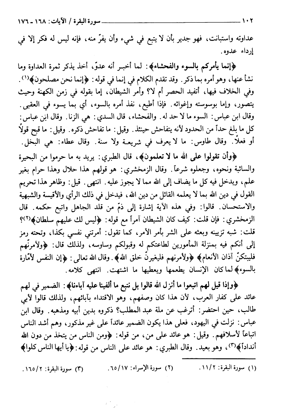 وَإِذا قِيلَ لَهُمُ اتَّبِعُوا مَا أَنْزَلَ اللَّهُ قالُوا بَلْ نَتَّبِعُ مَا أَلْفَيْنا عَلَيْهِ آباءَنا: الضَّمِيرُ فِي لَهُمْ عَائِدٌ عَلَى كَفَّارِ الْعَرَبِ، لِأَنَّ هَذَا كَانَ وَصْفَهُمْ، وَهُوَ الِاقْتِدَاءُ بِآبَائِهِمْ، وَلِذَلِكَ قَالُوا لِأَبِي طَالِبٍ، حِينَ احْتُضِرَ: أَتَرْغَبُ عَنْ مِلَّةِ عَبْدِ الْمُطَّلِبِ؟ ذَكَّرُوهُ بِدِينِ أَبِيهِ وَمَذْهَبِهِ. وَقَالَ ابْنُ عَبَّاسٍ: نَزَلَتْ فِي الْيَهُودِ، فَعَلَى هَذَا يَكُونُ الضَّمِيرُ عَائِدًا عَلَى غَيْرِ مَذْكُورٍ، وَهُمْ أَشَدُّ النَّاسِ اتِّبَاعًا لِأَسْلَافِهِمْ. وَقِيلَ: هُوَ عَائِدٌ عَلَى مَنْ، مِنْ قَوْلِهِ: وَمِنَ النَّاسِ مَنْ يَتَّخِذُ مِنْ دُونِ اللَّهِ أَنْداداً «3» ، وَهُوَ بَعِيدٌ. وَقَالَ الطَّبَرِيُّ: هُوَ عَائِدٌ عَلَى النَّاسِ مِنْ قَوْلِهِ: يَا أَيُّهَا النَّاسُ كُلُوا