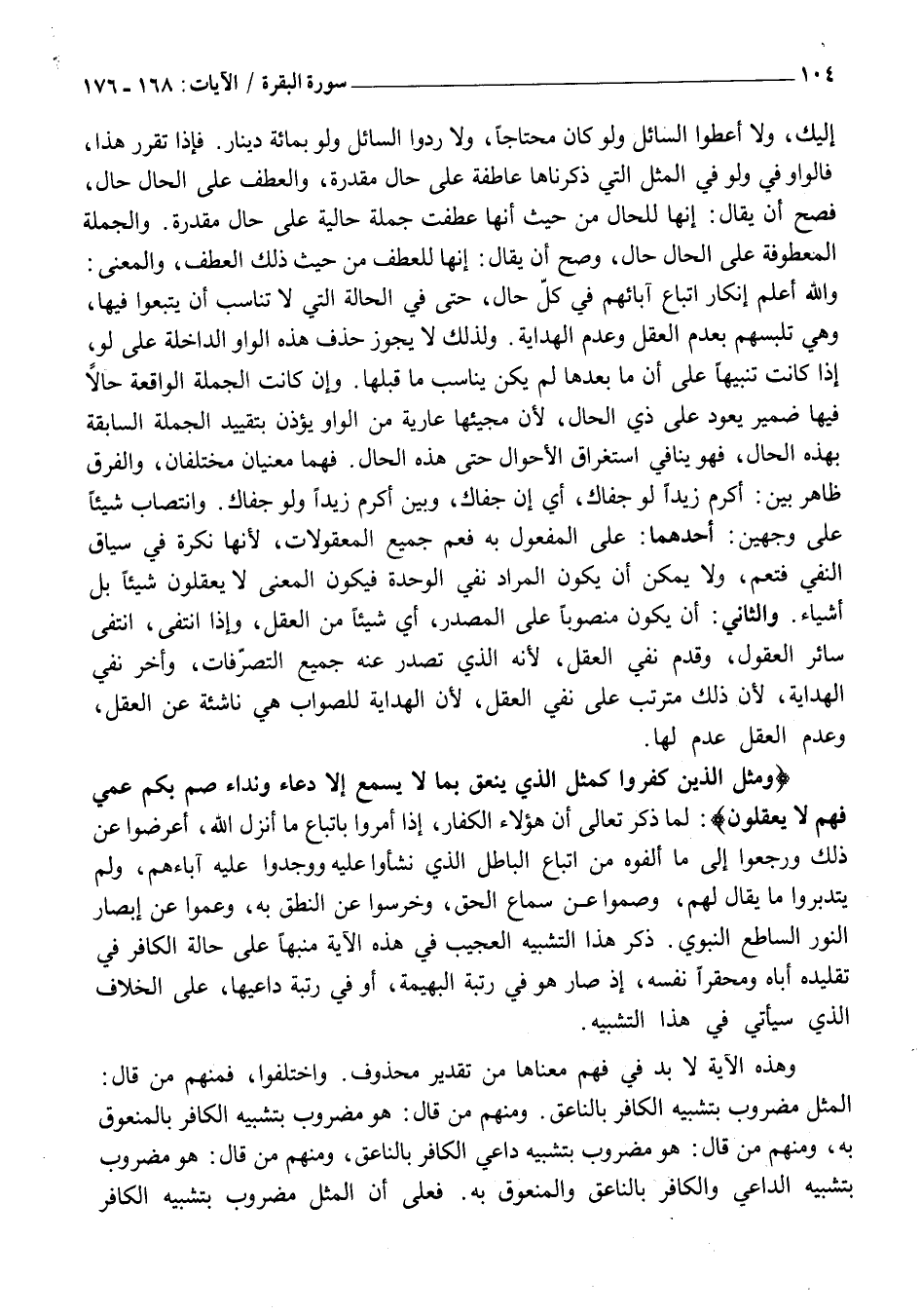 وَمَثَلُ الَّذِينَ كَفَرُوا كَمَثَلِ الَّذِي يَنْعِقُ بِما لَا يَسْمَعُ إِلَّا دُعاءً وَنِداءً صُمٌّ بُكْمٌ عُمْيٌ فَهُمْ لَا يَعْقِلُونَ: لَمَّا ذَكَرَ تَعَالَى أَنَّ هَؤُلَاءِ الْكُفَّارَ، إِذَا أُمِرُوا بِاتِّبَاعِ مَا أَنْزَلَ اللَّهُ، أَعْرَضُوا عَنْ ذَلِكَ وَرَجَعُوا إِلَى مَا أَلِفُوهُ مِنَ اتباع الباطل الذي نشأوا عَلَيْهِ وَوَجَدُوا عَلَيْهِ آبَاءَهُمْ، وَلَمْ يَتَدَبَّرُوا مَا يُقَالُ لَهُمْ، وَصَمُّوا عَنْ سَمَاعِ الْحَقِّ، وَخَرِسُوا عَنِ النُّطْقِ بِهِ، وَعَمُوا عَنْ إِبْصَارِ النُّورِ السَّاطِعِ النَّبَوِيِّ. ذَكَرَ هَذَا التَّشْبِيهَ الْعَجِيبَ فِي هَذِهِ الْآيَةِ مُنَبِّهًا عَلَى حَالَةِ الْكَافِرِ فِي تَقْلِيدِهِ أَبَاهُ وَمُحَقِّرًا نَفْسَهُ، إِذْ صَارَ هُوَ فِي رُتْبَةِ الْبَهِيمَةِ، أَوْ فِي رُتْبَةِ دَاعِيهَا، عَلَى الْخِلَافِ الَّذِي سَيَأْتِي فِي هَذَا التَّشْبِيهِ.
