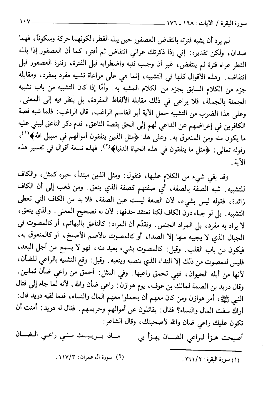 وَقَدْ بَقِيَ شَيْءٌ مِنَ الْكَلَامِ عَلَيْهَا، فَنَقُولُ: ومثل الَّذِينَ مُبْتَدَأٌ، خَبَرُهُ كَمَثَلِ، وَالْكَافُ لِلتَّشْبِيهِ. شَبَّهَ الصِّفَةَ بِالصِّفَةِ، أَيْ صِفَتُهُمْ كَصِفَةِ الَّذِي يَنْعِقُ. وَمَنْ ذَهَبَ إِلَى أَنَّ الْكَافَ زَائِدَةٌ، فَقَوْلُهُ لَيْسَ بِشَيْءٍ، لِأَنَّ الصِّفَةَ لَيْسَتْ عَيْنَ الصِّفَةِ، فَلَا بُدَّ مِنَ الْكَافِ الَّتِي تُعْطِي التَّشْبِيهَ. بَلْ لَوْ جَاءَ دُونَ الْكَافِ لَكُنَّا نَعْتَقِدُ حَذْفَهَا، لِأَنَّ بِهِ تَصْحِيحَ الْمَعْنَى. وَالَّذِي يَنْعِقُ، لَا يُرَادُ بِهِ مُفْرَدٌ، بَلِ الْمُرَادُ الْجِنْسُ. وَتَقَدَّمَ أَنَّ الْمُرَادَ: كَالنَّاعِقِ بِالْبَهَائِمِ، أَوْ كَالْمُصَوِّتِ فِي الْجِبَالِ الَّذِي لَا يُجِيبُهُ مِنْهَا إِلَّا الصَّدَا، أَوْ كَالْمُصَوِّتِ بِالْأَصَمِّ الْأَصْلَخِ، أَوِ كَالْمَنْعُوقِ بِهِ، فَيَكُونُ مِنْ بَابِ الْقَلْبِ. وَقِيلَ: كَالْمُصَوِّتِ بِشَيْءٍ بَعِيدٍ مِنْهُ، فَهُوَ لَا يَسْمَعُ مِنْ أَجْلِ الْبُعْدِ، فَلَيْسَ لِلْمُصَوِّتِ مِنْ ذَلِكَ إِلَّا النِّدَاءُ الَّذِي يُنْصِبُهُ وَيُتْعِبُهُ. وَقِيلَ: وَقَعَ التَّشْبِيهُ بِالرَّاعِي لِلضَّأْنِ، لِأَنَّهَا مِنْ أَبْلَهِ الْحَيَوَانِ، فَهِيَ تُحَمِّقُ رَاعِيَهَا. وَفِي الْمَثَلِ: أَحْمَقُ مِنْ رَاعِي ضَأْنٍ ثَمَانِينَ.