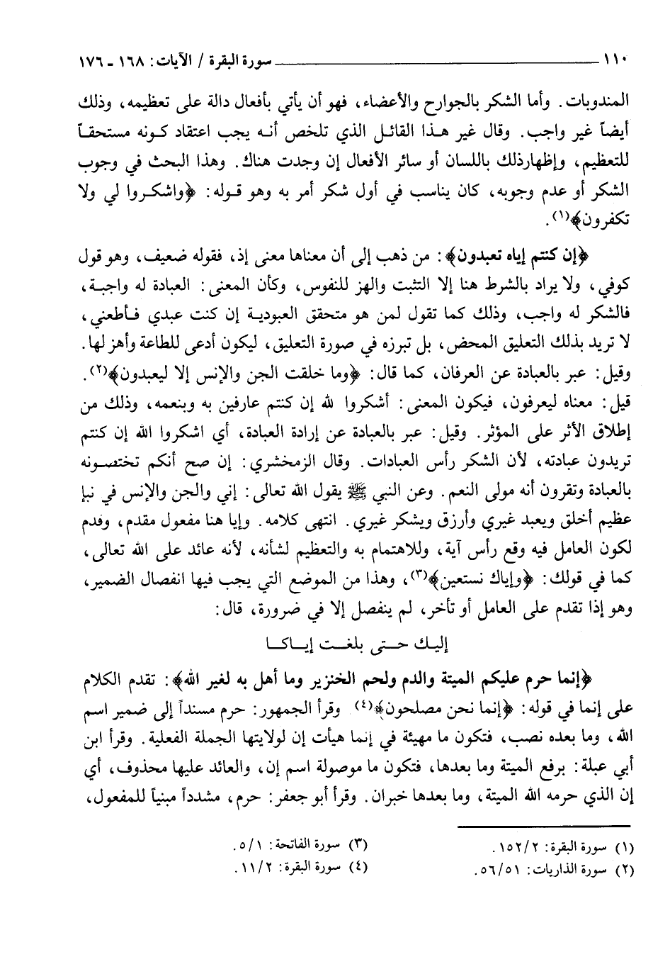 إِنْ كُنْتُمْ إِيَّاهُ تَعْبُدُونَ: مَنْ ذَهَبَ إِلَى أَنَّ مَعْنَاهَا مَعْنَى إِذْ، فَقَوْلُهُ ضَعِيفٌ، وَهُوَ قَوْلٌ كُوفِيٌّ، وَلَا يُرَادُ بِالشَّرْطِ هُنَا إِلَّا التَّثَبُّتُ وَالْهَزُّ لِلنُّفُوسِ، وَكَأَنَّ الْمَعْنَى: الْعِبَادَةُ لَهُ وَاجِبَةٌ، فَالشُّكْرُ لَهُ وَاجِبٌ، وَذَلِكَ كَمَا تَقُولُ لِمَنْ هُوَ مُتَحَقِّقُ الْعُبُودِيَّةِ إِنْ كُنْتَ عَبْدِي فَأَطِعْنِي، لَا تُرِيدُ بِذَلِكَ التَّعْلِيقَ الْمَحْضَ، بَلْ تُبْرِزُهُ فِي صُورَةِ التَّعْلِيقِ، لِيَكُونَ أدعى للطاعة وأهزلها.