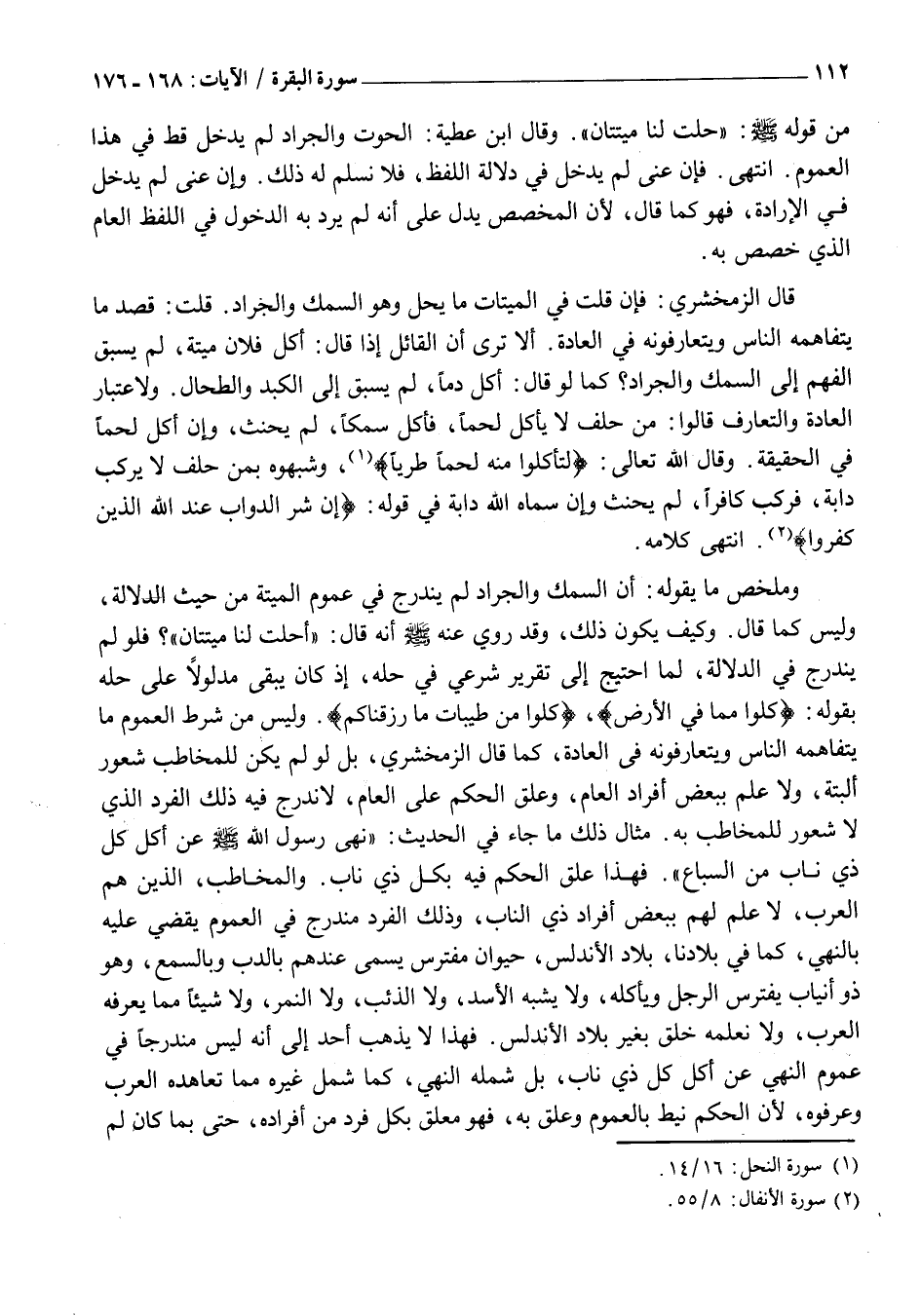 قَالَ الزَّمَخْشَرِيُّ: فَإِنْ قُلْتَ فِي الْمَيْتَاتِ مَا يَحِلُّ وَهُوَ السَّمَكُ وَالْجَرَادُ. قُلْتُ: قَصَدَ مَا يَتَفَاهَمُهُ النَّاسُ وَيَتَعَارَفُونَهُ فِي الْعَادَةِ. أَلَا تَرَى أَنَّ الْقَائِلَ إِذَا قَالَ: أَكَلَ فُلَانٌ مَيْتَةً، لَمْ يَسْبِقِ الْفَهْمُ إِلَى السَّمَكِ وَالْجَرَادِ؟ كَمَا لَوْ قَالَ: أَكَلَ دَمًا، لَمْ يَسْبِقْ إِلَى الْكَبِدِ وَالطِّحَالِ. وَلِاعْتِبَارِ الْعَادَةِ وَالتَّعَارُفِ قَالُوا: مَنْ حَلَفَ لَا يَأْكُلُ لَحْمًا، فَأَكَلَ سَمَكًا، لَمْ يَحْنَثْ، وَإِنْ أَكَلَ لَحْمًا فِي الْحَقِيقَةِ. وَقَالَ اللَّهُ تَعَالَى: لِتَأْكُلُوا مِنْهُ لَحْماً طَرِيًّا «1» ، وَشَبَّهُوهُ بِمَنْ حَلَفَ لَا يَرْكَبُ دَابَّةً، فَرَكِبَ كَافِرًا، لَمْ يَحْنَثْ وَإِنْ سَمَّاهُ اللَّهُ دَابَّةً فِي قَوْلِهِ: إِنَّ شَرَّ الدَّوَابِّ عِنْدَ اللَّهِ الَّذِينَ كَفَرُوا