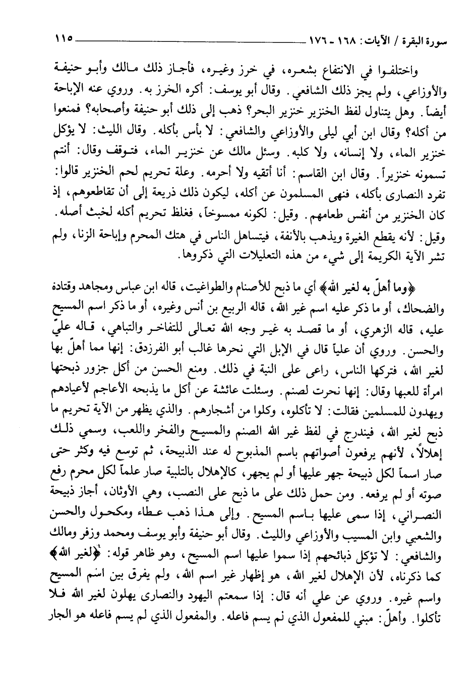 وَمَنَعَ الْحَسَنُ مِنْ أَكْلِ جَزُورٍ ذَبَحَتْهَا امْرَأَةٌ لِلَعِبِهَا وَقَالَ: إِنَّهَا نَحَرَتْ لِصَنَمٍ. وَسُئِلَتْ عَائِشَةُ عَنْ أَكْلِ مَا يَذْبَحُهُ الْأَعَاجِمُ لِأَعْيَادِهِمْ وَيَهْدُونَ لِلْمُسْلِمِينَ فَقَالَتْ: لَا تَأْكُلُوهُ، وَكُلُوا مِنْ أَشْجَارِهِمْ. وَالَّذِي يَظْهَرُ مِنَ الْآيَةِ تَحْرِيمُ مَا ذُبِحَ لِغَيْرِ اللَّهِ، فَيَنْدَرِجُ فِي لَفْظِ غَيْرِ اللَّهِ الصَّنَمُ وَالْمَسِيحُ وَالْفَخْرُ وَاللَّعِبُ، وَسُمِّيَ ذَلِكَ إِهْلَالًا، لِأَنَّهُمْ يَرْفَعُونَ أَصْوَاتَهُمْ بِاسْمِ الْمَذْبُوحِ لَهُ عِنْدَ الذَّبِيحَةِ، ثُمَّ تَوَسَّعَ فِيهِ وَكَثُرَ حَتَّى صَارَ اسْمًا لِكُلِّ ذَبِيحَةٍ جُهِرَ عَلَيْهَا أَوْ لَمْ يُجْهَرْ، كَالْإِهْلَالِ بِالتَّلْبِيَةِ صَارَ عَلَمًا لِكُلِّ مُحْرِمٍ رَفَعَ صَوْتَهُ أَوْ لَمْ يَرْفَعْهُ. وَمَنْ حَمَلَ ذَلِكَ عَلَى مَا ذُبِحَ عَلَى النُّصُبِ، وَهِيَ الْأَوْثَانُ، أَجَازَ ذَبِيحَةَ النَّصْرَانِيِّ، إِذَا سَمَّى عَلَيْهَا بِاسْمِ الْمَسِيحِ. وَإِلَى هَذَا ذَهَبَ عَطَاءٌ وَمَكْحُولٌ وَالْحَسَنُ وَالشَّعْبِيُّ وَابْنُ الْمُسَيَّبِ وَالْأَوْزَاعِيُّ وَاللَّيْثُ. وَقَالَ أَبُو حَنِيفَةَ وَأَبُو يُوسُفَ وَمُحَمَّدٌ وَزُفَرُ وَمَالِكٌ وَالشَّافِعِيُّ: لَا تُؤْكَلُ ذَبَائِحُهُمْ إِذَا سَمَّوْا عَلَيْهَا اسْمَ الْمَسِيحِ، وَهُوَ ظَاهِرُ قَوْلِهِ: لِغَيْرِ اللَّهِ كَمَا ذَكَرْنَاهُ، لِأَنَّ الْإِهْلَالَ لِغَيْرِ اللَّهِ، هُوَ إِظْهَارُ غَيْرِ اسْمِ اللَّهِ، وَلَمْ يُفَرِّقْ بَيْنَ اسْمِ الْمَسِيحِ وَاسْمِ غَيْرِهِ.