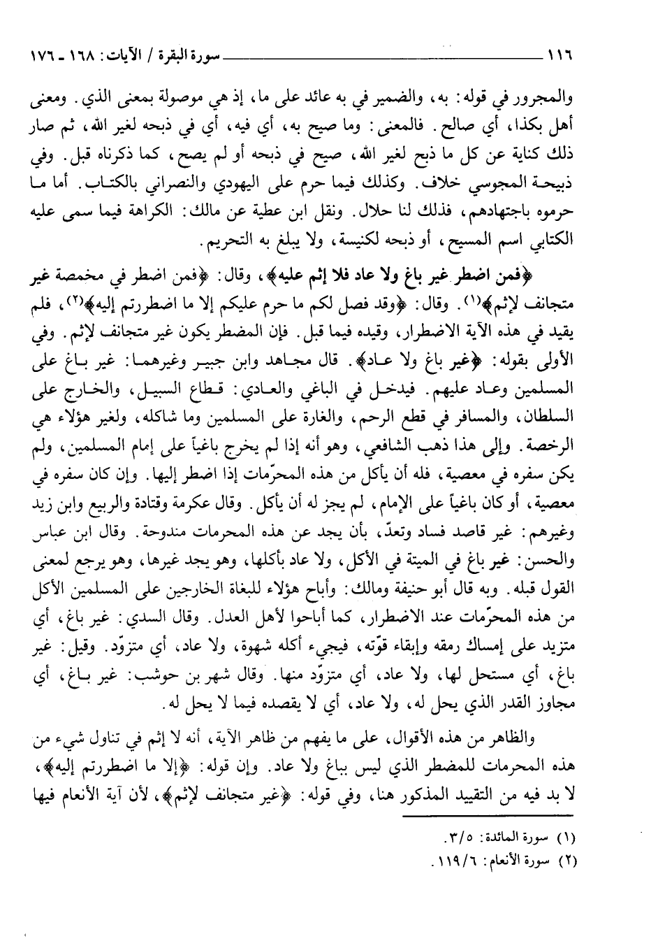 وَالظَّاهِرُ مِنْ هَذِهِ الْأَقْوَالِ، عَلَى مَا يُفْهَمُ مِنْ ظَاهِرِ الْآيَةِ، أَنَّهُ لَا إِثْمَ فِي تَنَاوُلِ شَيْءٍ مِنْ هَذِهِ الْمُحَرَّمَاتِ لِلْمُضْطَرِّ الَّذِي لَيْسَ بِبَاغٍ وَلَا عَادٍ. وَإِنَّ قَوْلَهُ: إِلَّا مَا اضْطُرِرْتُمْ إِلَيْهِ، لَا بُدَّ فِيهِ مِنَ التَّقْيِيدِ الْمَذْكُورِ هُنَا، وَفِي قَوْلِهِ: غَيْرَ مُتَجانِفٍ لِإِثْمٍ، لِأَنَّ آية الأنعام فيها