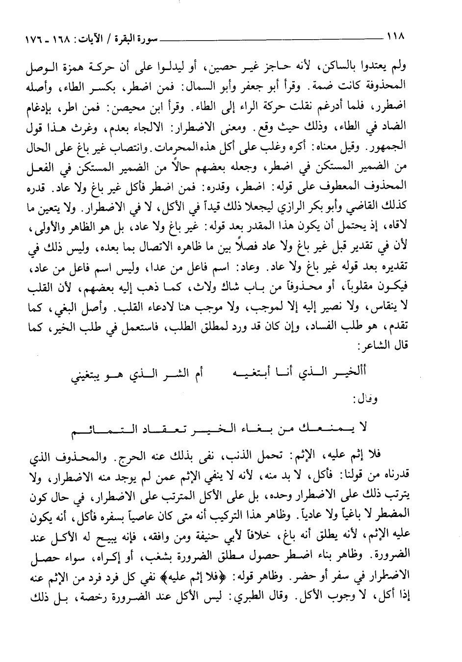 وَلَمْ يَعْتَدُّوا بِالسَّاكِنِ، لِأَنَّهُ حَاجِزٌ غَيْرُ حَصِينٍ، أَوْ لِيَدُلُّوا عَلَى أَنَّ حَرَكَةَ هَمْزَةِ الْوَصْلِ الْمَحْذُوفَةِ كَانَتْ ضَمَّةً. وَقَرَأَ أَبُو جَعْفَرٍ وَأَبُو السَّمَالِ: فَمَنِ اضْطِرَّ، بِكَسْرِ الطَّاءِ، وَأَصْلُهُ اضْطَرَرَ، فَلَمَّا أُدْغِمَ نُقِلَتْ حَرَكَةُ الرَّاءِ إِلَى الطَّاءِ. وَقَرَأَ ابْنُ مُحَيْصِنٍ: فَمَنِ اطَّرَّ، بِإِدْغَامِ الضَّادِ فِي الطَّاءِ، وَذَلِكَ حَيْثُ وَقَعَ. وَمَعْنَى الِاضْطِرَارِ: الِالْجَاءُ بِعَدَمٍ، وَغَرَثٍ هَذَا قَوْلُ الْجُمْهُورِ. وَقِيلَ مَعْنَاهُ: أُكْرِهَ وَغُلِبَ عَلَى أَكْلِ هَذِهِ الْمُحَرَّمَاتِ. وَانْتِصَابُ غَيْرَ بَاغٍ عَلَى الْحَالِ مِنَ الضَّمِيرِ المستكن في اضْطُرَّ، وَجَعَلَهُ بَعْضُهُمْ حَالًا مِنَ الضَّمِيرِ الْمَسْتَكِنِّ في الْفِعْلِ الْمَحْذُوفِ الْمَعْطُوفِ عَلَى قوله: اضطر، وقدره: فَمَنِ اضْطُرَّ فَأَكَلَ غَيْرَ بَاغٍ وَلَا عَادٍ. قَدَّرَهُ كَذَلِكَ الْقَاضِي وَأَبُو بَكْرٍ الرَّازِيُّ لِيَجْعَلَا ذَلِكَ قَيْدًا فِي الْأَكْلِ، لَا فِي الِاضْطِرَارِ. وَلَا يَتَعَيَّنُ مَا لَاقَاهُ، إِذْ يُحْتَمَلُ أَنْ يَكُونَ هَذَا الْمُقَدَّرُ بَعْدَ قَوْلِهِ: غَيْرَ بَاغٍ وَلَا عَادٍ، بَلْ هُوَ الظَّاهِرُ وَالْأَوْلَى، لِأَنَّ فِي تَقْدِيرِ قَبْلَ غَيْرَ بَاغٍ وَلَا عَادٍ فَصْلًا بَيْنَ مَا ظَاهِرُهُ الِاتِّصَالُ بِمَا بَعْدَهُ، وَلَيْسَ ذَلِكَ فِي تَقْدِيرِهِ بَعْدَ قَوْلِهِ غَيْرَ بَاغٍ وَلَا عَادٍ. وعاد: اسْمُ فَاعِلٍ مِنْ عَدَا، وَلَيْسَ اسْمَ فَاعِلٍ مَنْ عَادَ، فَيَكُونُ مَقْلُوبًا، أَوْ مَحْذُوفًا مِنْ بَابِ شَاكَ وَلَاثَ، كَمَا ذَهَبَ إِلَيْهِ بَعْضُهُمْ، لِأَنَّ الْقَلْبَ لَا يَنْقَاسُ، وَلَا نَصِيرُ إِلَيْهِ إِلَّا لِمُوجِبٍ، وَلَا مُوجِبَ هُنَا لِادِّعَاءِ الْقَلْبِ. وَأَصْلُ الْبَغْيِ، كَمَا تَقَدَّمَ، هُوَ طَلَبُ الْفَسَادِ، وَإِنْ كَانَ قَدْ وَرَدَ لِمُطْلَقِ الطَّلَبِ، فَاسْتُعْمِلَ فِي طَلَبِ الْخَيْرِ، كَمَا قَالَ الشَّاعِرُ: