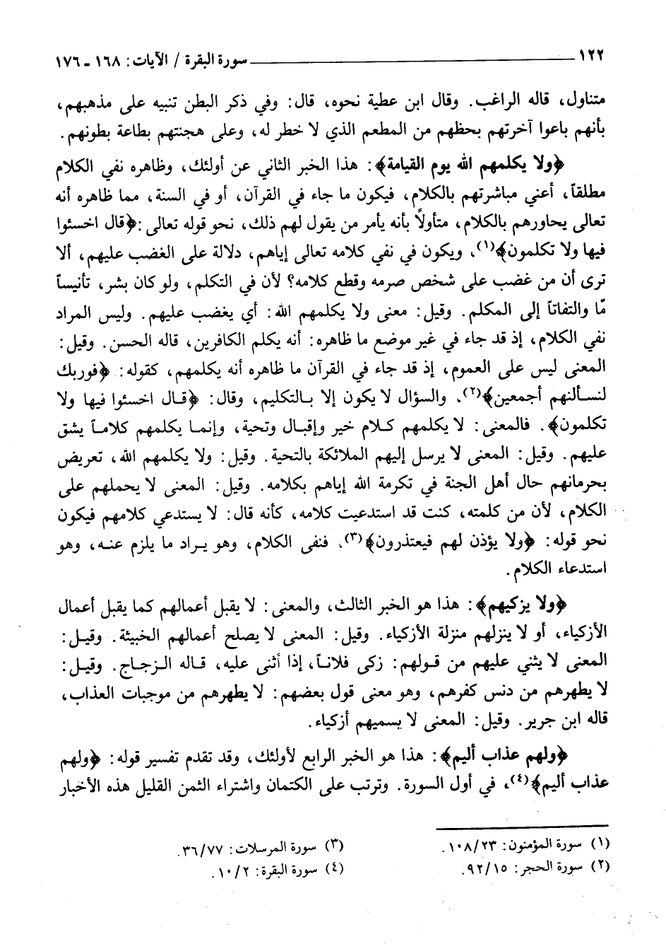 وَلا يُكَلِّمُهُمُ اللَّهُ يَوْمَ الْقِيامَةِ: هَذَا الْخَبَرُ الثَّانِي عَنْ أُولَئِكَ، وَظَاهِرُهُ نَفْيُ الْكَلَامِ مُطْلَقًا، أَعْنِي مُبَاشَرَتَهُمْ بِالْكَلَامِ، فَيَكُونُ مَا جَاءَ فِي الْقُرْآنِ، أَوْ فِي السُّنَّةِ، مِمَّا ظَاهِرُهُ أَنَّهُ تَعَالَى يُحَاوِرُهُمْ بِالْكَلَامِ، مُتَأَوَّلًا بِأَنَّهُ يَأْمُرُ مَنْ يَقُولُ لَهُمْ ذَلِكَ، نَحْوَ قَوْلِهِ تعالى: قالَ اخْسَؤُا فِيها وَلا تُكَلِّمُونِ «1» ، وَيَكُونُ فِي نَفْيِ كَلَامِهِ تَعَالَى إِيَّاهُمْ، دَلَالَةٌ عَلَى الْغَضَبِ عَلَيْهِمْ، أَلَا تَرَى أَنَّ مَنْ غَضِبَ عَلَى شَخْصٍ صَرَمَهُ وَقَطَعَ كَلَامَهُ؟ لِأَنَّ فِي التَّكَلُّمِ، وَلَوْ كَانَ بِشَرٍّ، تَأْنِيسًا مَا وَالْتِفَاتًا إِلَى الْمُكَلَّمِ. وَقِيلَ: مَعْنَى وَلَا يُكَلِّمُهُمُ اللَّهُ: أَيْ يَغْضَبُ عَلَيْهِمْ. وَلَيْسَ الْمُرَادُ نَفْيُ الْكَلَامِ، إِذْ قَدْ جَاءَ فِي غَيْرِ مَوْضِعٍ مَا ظَاهِرُهُ: أَنَّهُ يُكَلِّمُ الْكَافِرِينَ، قَالَهُ الْحَسَنُ. وَقِيلَ: