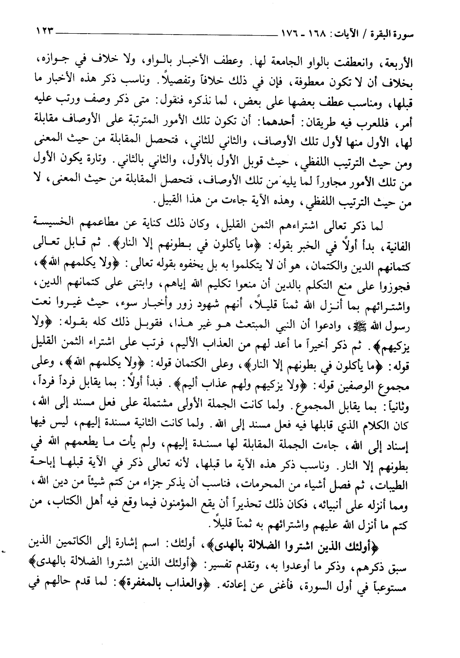 لَمَّا ذَكَرَ تَعَالَى اشْتِرَاءَهُمُ الثَّمَنَ الْقَلِيلَ، وَكَانَ ذَلِكَ كِنَايَةً عَنْ مَطَاعِمِهِمُ الْخَسِيسَةِ الْفَانِيَةِ، بَدَأَ أَوَّلًا فِي الْخَبَرِ بِقَوْلِهِ: مَا يَأْكُلُونَ فِي بُطُونِهِمْ إِلَّا النَّارَ. ثُمَّ قَابَلَ تَعَالَى كِتْمَانَهُمُ الدِّينَ وَالْكِتْمَانُ، هُوَ أَنْ لَا يَتَكَلَّمُوا بِهِ بَلْ يُخْفُوهُ بِقَوْلِهِ تَعَالَى: وَلا يُكَلِّمُهُمُ اللَّهُ، فَجُوزُوا عَلَى مَنْعِ التَّكَلُّمِ بِالدِّينِ أَنْ مُنِعُوا تَكْلِيمَ اللَّهِ إِيَّاهُمْ، وَابْتَنَى عَلَى كِتْمَانِهِمُ الدِّينَ، وَاشْتِرَائِهِمْ بِمَا أَنْزَلَ اللَّهُ ثَمَنًا قَلِيلًا، أَنَّهُمْ شُهُودُ زُورٍ وَأَخْبَارُ سُوءٍ، حَيْثُ غَيَّرُوا نَعْتَ رَسُولِ اللَّهِ صَلَّى اللَّهُ عَلَيْهِ وَسَلَّمَ، وَادَّعُوا أَنَّ النَّبِيَّ الْمُبْتَعَثَ هُوَ غَيْرُ هَذَا، فَقُوبِلَ ذَلِكَ كُلُّهُ بِقَوْلِهِ: وَلا يُزَكِّيهِمْ. ثُمَّ ذَكَرَ أَخِيرًا مَا أُعِدَّ لَهُمْ مِنَ الْعَذَابِ الْأَلِيمِ، فَرَتَّبَ عَلَى اشْتِرَاءِ الثَّمَنِ الْقَلِيلِ قوله: ما يَأْكُلُونَ فِي بُطُونِهِمْ إِلَّا النَّارَ، وَعَلَى الْكِتْمَانِ قَوْلَهُ: وَلا يُكَلِّمُهُمُ اللَّهُ، وَعَلَى مَجْمُوعِ الْوَصْفَيْنِ قَوْلَهُ: وَلا يُزَكِّيهِمْ وَلَهُمْ عَذابٌ أَلِيمٌ. فَبَدَأَ أَوَّلًا: بِمَا يُقَابِلُ فَرْدًا فَرْدًا، وَثَانِيًا: بِمَا يُقَابِلُ الْمَجْمُوعَ. وَلَمَّا كَانَتِ الْجُمْلَةُ الْأَوْلَى مُشْتَمِلَةً عَلَى فِعْلٍ مُسْنَدٍ إِلَى اللَّهِ، كَانَ الْكَلَامُ الَّذِي قَابَلَهَا فِيهِ فِعْلٌ مُسْنَدٌ إِلَى اللَّهِ. وَلَمَّا كَانَتِ الثَّانِيَةُ مُسْنَدَةً إِلَيْهِمْ، لَيْسَ فِيهَا إِسْنَادٌ إِلَى اللَّهِ، جَاءَتِ الْجُمْلَةُ الْمُقَابَلَةُ لَهَا مُسْنَدَةً إِلَيْهِمْ، وَلَمْ يَأْتِ مَا يُطْعِمُهُمُ اللَّهُ فِي بُطُونِهِمْ إِلَّا النَّارَ. وَنَاسَبَ ذِكْرُ هَذِهِ الْآيَةِ مَا قَبْلَهَا، لِأَنَّهُ تَعَالَى ذَكَرَ فِي الْآيَةِ قَبْلَهَا إِبَاحَةَ الطَّيِّبَاتِ، ثُمَّ فَصَّلَ أَشْيَاءً مِنَ الْمُحَرَّمَاتِ، فَنَاسَبَ أَنْ يَذْكُرَ جَزَاءَ مَنْ كَتَمَ شَيْئًا مِنْ دِينِ اللَّهِ، وَمِمَّا أَنْزَلَهُ عَلَى أَنْبِيَائِهِ، فَكَانَ ذَلِكَ تَحْذِيرًا أَنْ يَقَعَ الْمُؤْمِنُونَ فِيمَا وَقَعَ فِيهِ أَهْلُ الْكِتَابِ، من كتم ما أنزل اللَّهُ عَلَيْهِمْ وَاشْتِرَائِهِمْ بِهِ ثَمَنًا قَلِيلًا.