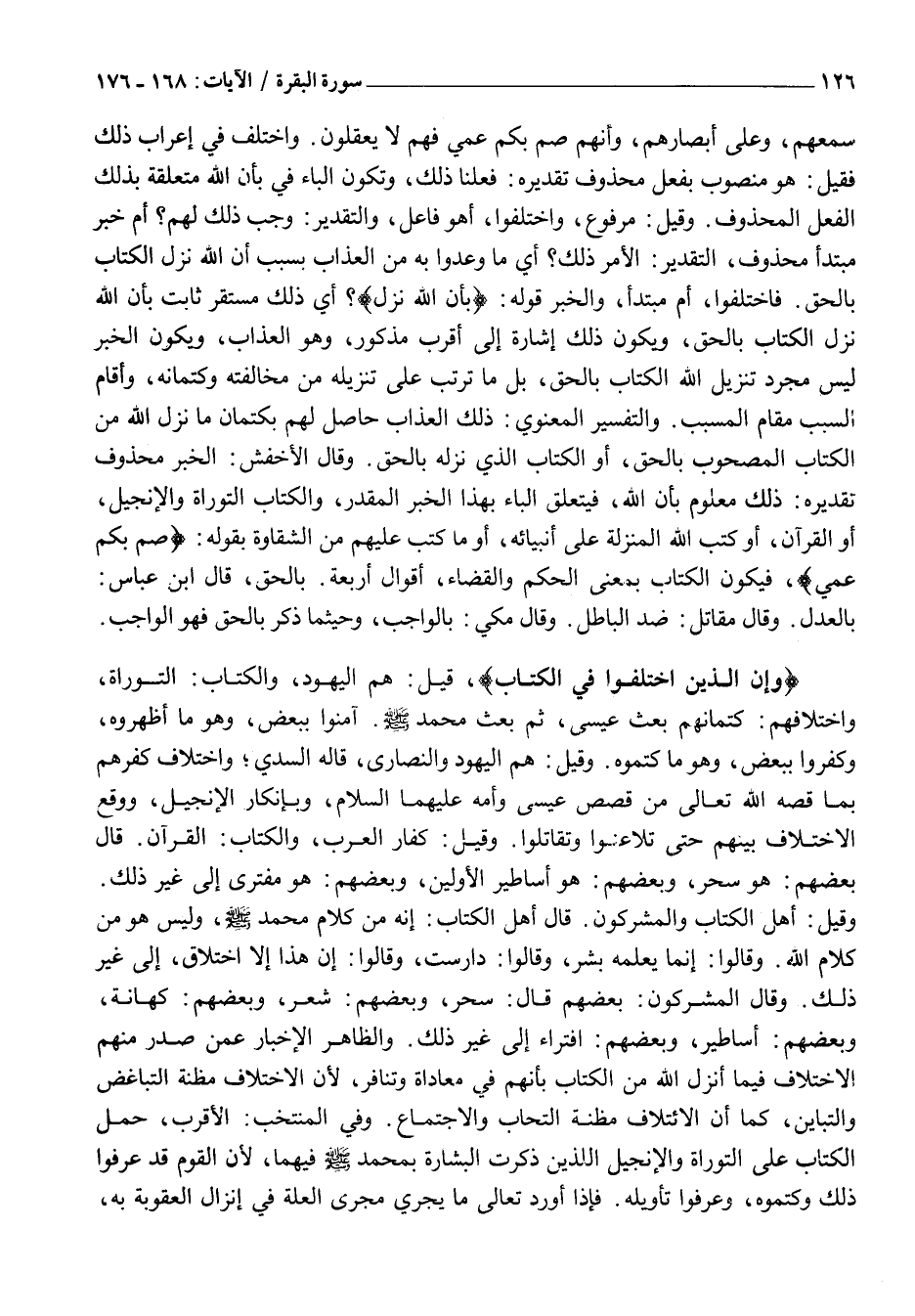 وَقِيلَ: أَهْلُ الْكِتَابِ وَالْمُشْرِكُونَ. قَالَ أَهْلُ الْكِتَابِ: إِنَّهُ مِنْ كَلَامِ محمد صلى الله عليه وَسَلَّمَ، وَلَيْسَ هُوَ مِنْ كَلَامِ اللَّهِ. وَقَالُوا: إِنَّمَا يُعَلِّمُهُ بَشَرٌ، وَقَالُوا: دَارَسْتَ، وَقَالُوا: إِنْ هَذَا إِلَّا اخْتِلَاقٌ، إِلَى غَيْرِ ذَلِكَ. وَقَالَ الْمُشْرِكُونَ: بَعْضُهُمْ قَالَ: سِحْرٌ، وَبَعْضُهُمْ: شِعْرٌ، وَبَعْضُهُمْ: كهانة، وبعضهم: ساطير، وَبَعْضُهُمُ: افْتِرَاءٌ إِلَى غَيْرِ ذَلِكَ. وَالظَّاهِرُ الْإِخْبَارُ عَمَّنْ صَدَرَ مِنْهُمُ الِاخْتِلَافُ فِيمَا أَنْزَلَ اللَّهُ مِنَ الْكِتَابِ بِأَنَّهُمْ فِي مُعَادَاةٍ وَتَنَافُرٍ، لِأَنَّ الِاخْتِلَافَ مَظِنَّةُ التَّبَاغُضِ وَالتَّبَايُنِ، كَمَا أَنَّ الِائْتِلَافَ مَظِنَّةُ التَّحَابِّ وَالِاجْتِمَاعِ. وَفِي الْمُنْتَخَبِ: الْأَقْرَبُ، حَمْلُ الْكِتَابِ عَلَى التَّوْرَاةِ وَالْإِنْجِيلِ اللَّذَيْنِ ذَكَرَتِ الْبِشَارَةَ بِمُحَمَّدٍ صَلَّى اللَّهُ عَلَيْهِ وَسَلَّمَ فِيهِمَا، لِأَنَّ الْقَوْمَ قَدْ عَرَفُوا ذَلِكَ وَكَتَمُوهُ، وَعَرَفُوا تَأْوِيلَهُ. فَإِذَا أَوْرَدَ تَعَالَى مَا يَجْرِي مَجْرَى الْعِلَّةِ فِي إِنْزَالِ الْعُقُوبَةِ بِهِ،
