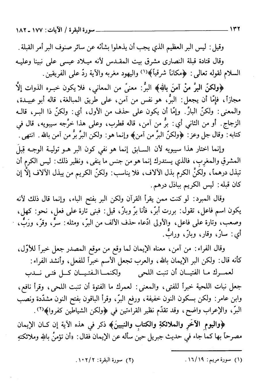 وَلكِنَّ الْبِرَّ مَنْ آمَنَ بِاللَّهِ الْبِرُّ: مَعْنًى مِنَ الْمَعَانِي، فَلَا يَكُونُ خَبَرُهُ الذَّوَاتَ إِلَّا مَجَازًا، فَإِمَّا أَنْ يُجْعَلَ: الْبِرُّ، هُوَ نَفْسَ مَنْ آمَنَ، عَلَى طَرِيقِ الْمُبَالَغَةِ، قَالَهُ أَبُو عُبَيْدَةَ، وَالْمَعْنَى: وَلَكِنَّ الْبَارَّ. وَإِمَّا أَنْ يَكُونَ عَلَى حَذْفٍ مِنَ الْأَوَّلِ، أَيْ: وَلَكِنَّ ذَا الْبِرِّ، قَالَهُ الزَّجَّاجُ. أَوْ مِنَ الثَّانِي أَيْ: بِرُّ مَنْ آمَنَ، قَالَهُ قُطْرُبٌ، وَعَلَى هَذَا خَرَّجَهُ سِيبَوَيْهِ، قَالَ فِي كِتَابِهِ: وَقَالَ جَلَّ وَعَزَّ: وَلكِنَّ الْبِرَّ مَنْ آمَنَ وَإِنَّمَا هُوَ: وَلَكِنَّ الْبِرَّ بِرُّ مَنْ آمَنَ بِاللَّهِ. انْتَهَى.