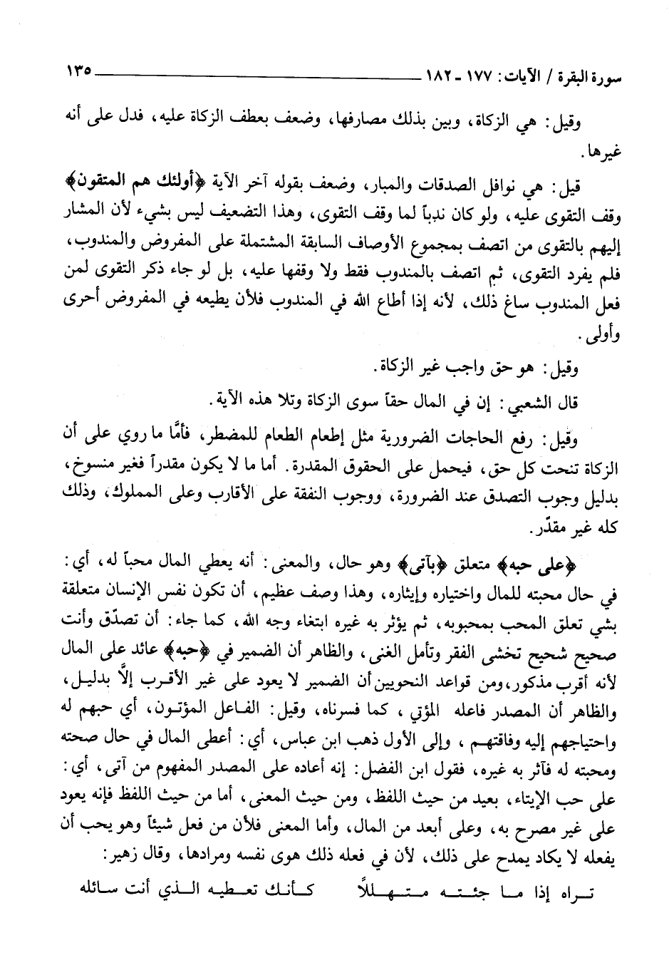 قيل: هِيَ نَوَافِلُ الصَّدَقَاتِ وَالْمَبَارِّ، وَضُعِّفَ بِقَوْلِهِ آخِرَ الْآيَةِ أُولئِكَ هُمُ الْمُتَّقُونَ وَقَفَ التَّقْوَى عَلَيْهِ، وَلَوْ كَانَ نَدْبًا لَمَا وَقَفَ التَّقْوَى، وَهَذَا التَّضْعِيفُ لَيْسَ بِشَيْءٍ لِأَنَّ الْمُشَارَ إِلَيْهِمْ بِالتَّقْوَى مَنِ اتَّصَفَ بِمَجْمُوعِ الْأَوْصَافِ السَّابِقَةِ الْمُشْتَمِلَةِ عَلَى الْمَفْرُوضِ وَالْمَنْدُوبِ، فَلَمْ يُفْرِدِ التَّقْوَى، ثُمَّ اتَّصَفَ بِالْمَنْدُوبِ فَقَطْ وَلَا وَقَفَهَا عَلَيْهِ، بَلْ لَوْ جَاءَ ذِكْرُ التَّقْوَى لِمَنْ فَعَلَ الْمَنْدُوبَ سَاغَ ذَلِكَ، لِأَنَّهُ إِذَا أَطَاعَ اللَّهَ فِي الْمَنْدُوبِ فَلَأَنْ يُطِيعَهُ فِي الْمَفْرُوضِ أَحْرَى وَأَوْلَى.