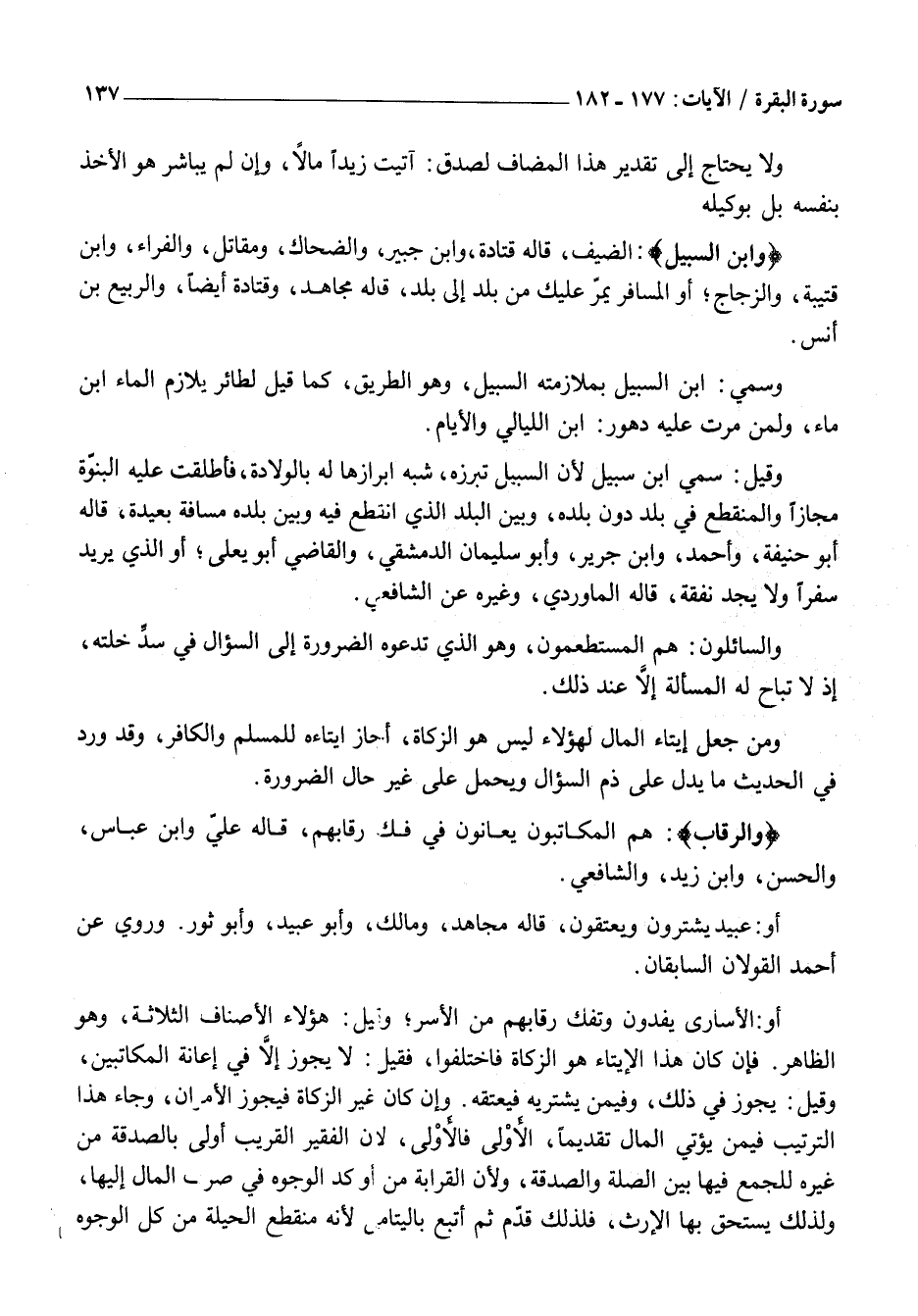 أَوِ: الْأُسَارَى يُفْدَوْنَ وَتُفَكُّ رِقَابُهُمْ مِنَ الْأَسْرِ وَقِيلَ: هَؤُلَاءِ الْأَصْنَافُ الثَّلَاثَةُ، وَهُوَ الظَّاهِرُ. فَإِنْ كَانَ هَذَا الْإِيتَاءُ هُوَ الزَّكَاةَ فَاخْتَلَفُوا، فَقِيلَ: لَا يَجُوزُ إِلَّا فِي إِعَانَةِ الْمُكَاتَبِينَ، وَقِيلَ: يَجُوزُ فِي ذَلِكَ، وَفِيمَنْ يَشْتَرِيهِ فَيُعْتِقُهُ. وَإِنْ كَانَ غَيْرَ الزَّكَاةِ فَيَجُوزُ الْأَمْرَانِ، وَجَاءَ هَذَا التَّرْتِيبُ فِيمَنْ يُؤْتِي الْمَالَ تَقْدِيمًا، الْأَوْلَى فَالْأَوْلَى، لِأَنَّ الْفَقِيرَ الْقَرِيبَ أَوْلَى بِالصَّدَقَةِ مِنْ غَيْرِهِ لِلْجَمْعِ فِيهَا بَيْنَ الصِّلَةِ وَالصَّدَقَةِ، وَلِأَنَّ القرابة من أو كد الْوُجُوهِ فِي صَرْفِ الْمَالِ إِلَيْهَا، وَلِذَلِكَ يُسْتَحَقُّ بِهَا الْإِرْثُ، فَلِذَلِكَ قَدَّمَ ثُمَّ أَتْبَعَ بِالْيَتَامَى لِأَنَّهُ مُنْقَطِعُ الْحِيلَةِ مِنْ كُلِّ الْوُجُوهِ