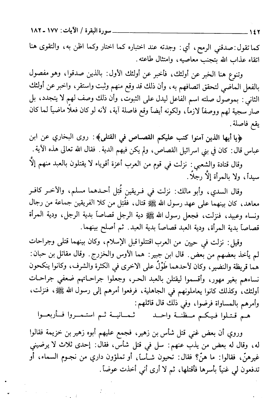 وَقِيلَ: نزلت في حين مِنَ الْعَرَبِ اقْتَتَلُوا قَبْلَ الْإِسْلَامِ، وَكَانَ بَيْنَهُمَا قَتْلَى وَجِرَاحَاتٌ لَمْ يَأْخُذْ بَعْضُهُمْ مِنْ بَعْضٍ. قَالَ ابْنُ جُبَيْرٍ: هُمَا الْأَوْسُ وَالْخَزْرَجُ. وقال مقاتل بن حبان: هُمَا قُرَيْظَةُ وَالنَّضِيرُ، وَكَانَ لِأَحَدِهِمَا طَوْلٌ عَلَى الْأُخْرَى فِي الْكَثْرَةِ وَالشَّرَفِ، وَكَانُوا يَنْكِحُونَ نِسَاءَهُمْ بِغَيْرِ مُهُورٍ، وَأَقْسَمُوا لَيَقْتُلُنَّ بِالْعَبْدِ الْحُرَّ، وَجَعَلُوا جِرَاحَاتِهِمْ ضِعْفَيْ جِرَاحَاتِ أُولَئِكَ، وَكَذَلِكَ كَانُوا يُعَامِلُونَهُمْ فِي الْجَاهِلِيَّةِ، فَرَفَعُوا أَمْرَهُمْ إِلَى رَسُولِ اللَّهِ صَلَّى اللَّهُ عَلَيْهِ وَسَلَّمَ، فَنَزَلَتْ، وَأَمَرَهُمْ بِالْمُسَاوَاةِ فَرَضُوا