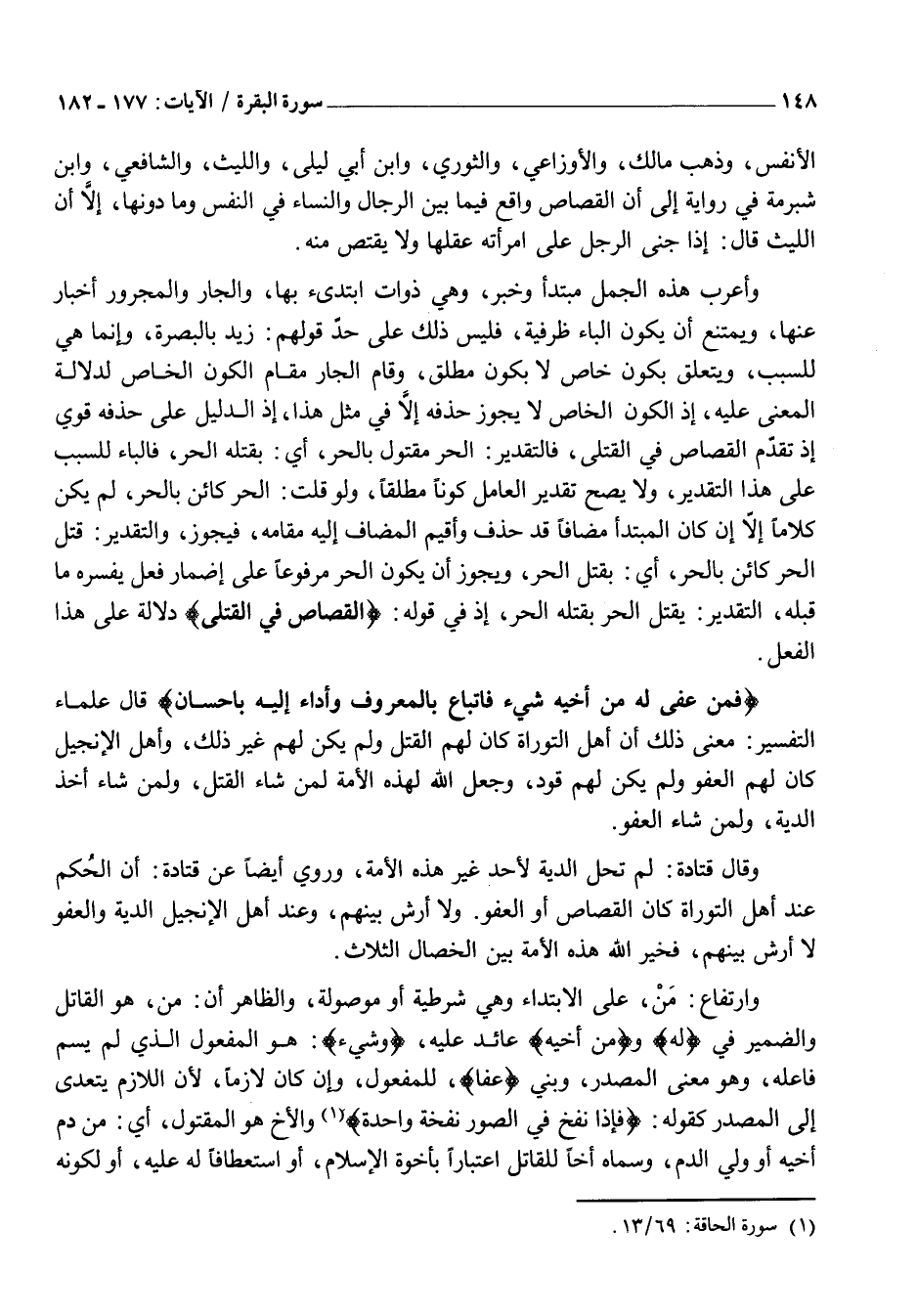 وَأَعْرَبَ هذه الجمل مبتدأ وخبر، وَهِيَ ذَوَاتٌ ابْتُدِئَ بِهَا، وَالْجَارُّ وَالْمَجْرُورُ أَخْبَارٌ عَنْهَا، وَيَمْتَنِعُ أَنْ يَكُونَ الْبَاءُ ظَرْفِيَّةً، فَلَيْسَ ذَلِكَ عَلَى حَدِّ قَوْلِهِمْ: زَيْدٌ بِالْبَصْرَةِ، وَإِنَّمَا هِيَ لِلسَّبَبِ، وَيَتَعَلَّقُ بِكَوْنٍ خَاصٍّ لَا بِكَوْنٍ مُطْلَقٍ، وَقَامَ الْجَارُّ مَقَامَ الْكَوْنِ الْخَاصِّ لِدَلَالَةِ الْمَعْنَى عَلَيْهِ، إِذِ الْكَوْنُ الْخَاصُّ لَا يَجُوزُ حَذْفُهُ إِلَّا فِي مِثْلِ هَذَا، إِذِ الدَّلِيلُ عَلَى حَذْفِهِ قَوِيٌّ إِذْ تَقَدَّمَ الْقِصَاصُ فِي الْقَتْلَى، فَالتَّقْدِيرُ: الْحُرُّ مَقْتُولٌ بِالْحُرِّ، أَيْ: بِقَتْلِهِ الْحُرَّ، فَالْبَاءُ لِلسَّبَبِ عَلَى هَذَا التَّقْدِيرِ، وَلَا يَصِحُّ تَقْدِيرُ الْعَامِلِ كَوْنًا مُطْلَقًا، وَلَوْ قُلْتَ: الْحُرُّ كَائِنٌ بِالْحُرِّ، لَمْ يَكُنْ كَلَامًا إِلَّا إِنْ كَانَ الْمُبْتَدَأُ مُضَافًا قَدْ حُذِفَ وَأُقِيمَ الْمُضَافُ إِلَيْهِ مَقَامَهُ، فَيَجُوزُ، وَالتَّقْدِيرُ: قَتْلُ الْحُرِّ كَائِنٌ بِالْحُرِّ، أي: بقتل الْحُرَّ، وَيَجُوزُ أَنْ يَكُونَ الْحُرُّ مَرْفُوعًا عَلَى إِضْمَارِ فِعْلٍ يُفَسِّرُهُ مَا قَبْلَهُ، التقدير: يُقْتَلُ الْحُرُّ بِقَتْلِهِ الْحُرَّ، إِذْ فِي قَوْلِهِ: الْقِصاصُ فِي الْقَتْلى دَلَالَةٌ عَلَى هَذَا الْفِعْلِ.