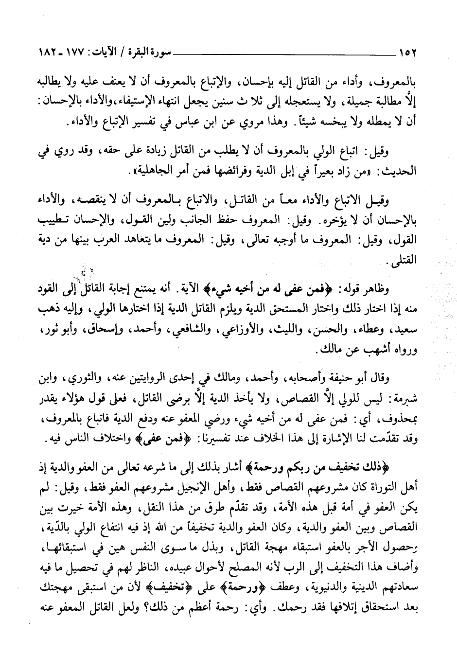 وَقَالَ أَبُو حَنِيفَةَ وَأَصْحَابُهُ، وَأَحْمَدُ، وَمَالِكٌ فِي إِحْدَى الرِّوَايَتَيْنِ عَنْهُ، وَالثَّوْرِيُّ، وَابْنُ شُبْرُمَةَ: لَيْسَ لِلْوَلِيِّ إِلَّا الْقِصَاصُ، وَلَا يَأْخُذُ الدِّيَةَ إِلَّا بِرِضَى الْقَاتِلِ، فَعَلَى قَوْلِ هَؤُلَاءِ يُقَدَّرُ بِمَحْذُوفٍ، أَيْ: فَمَنْ عُفِيَ لَهُ مِنْ أَخِيهِ شَيْءٌ وَرَضِيَ الْمَعْفُوُّ عنه وَدَفَعَ الدِّيَةَ فَاتِّبَاعٌ بِالْمَعْرُوفِ، وَقَدْ تَقَدَّمَتْ لَنَا الْإِشَارَةُ إِلَى هَذَا الْخِلَافِ عِنْدَ تَفْسِيرِنَا: فَمَنْ عُفِيَ وَاخْتِلَافَ النَّاسِ فِيهِ.