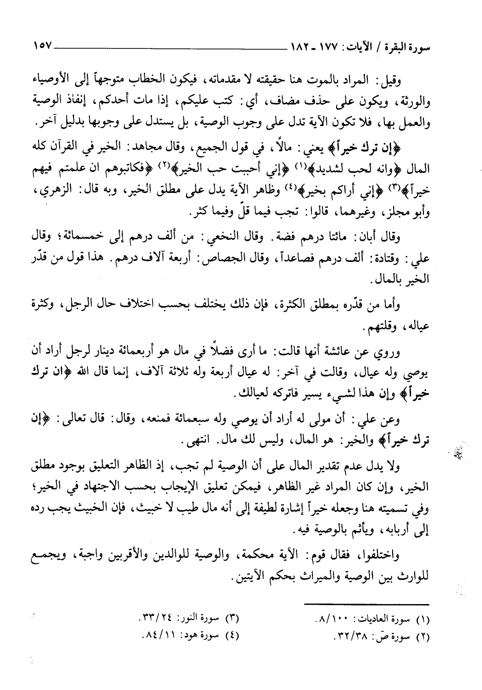 وَلَا يَدُلُّ عَدَمُ تَقْدِيرِ الْمَالِ عَلَى أَنَّ الْوَصِيَّةَ لَمْ تَجِبْ، إِذِ الظَّاهِرُ التَّعْلِيقُ بِوُجُودِ مُطْلَقِ الْخَيْرِ، وَإِنْ كَانَ الْمُرَادُ غَيْرَ الظَّاهِرِ، فَيُمْكِنُ تَعْلِيقُ الْإِيجَابِ بِحَسَبِ الِاجْتِهَادِ فِي الْخَيْرِ وَفِي تَسْمِيَتِهِ هُنَا وَجَعْلِهِ خَيْرًا إِشَارَةٌ لَطِيفَةٌ إِلَى أَنَّهُ مَالٌ طَيِّبٌ لَا خَبِيثٌ، فَإِنَّ الْخَبِيثَ يَجِبُ رَدُّهُ إِلَى أَرْبَابِهِ، وَيَأْثَمُ بِالْوَصِيَّةِ فِيهِ.