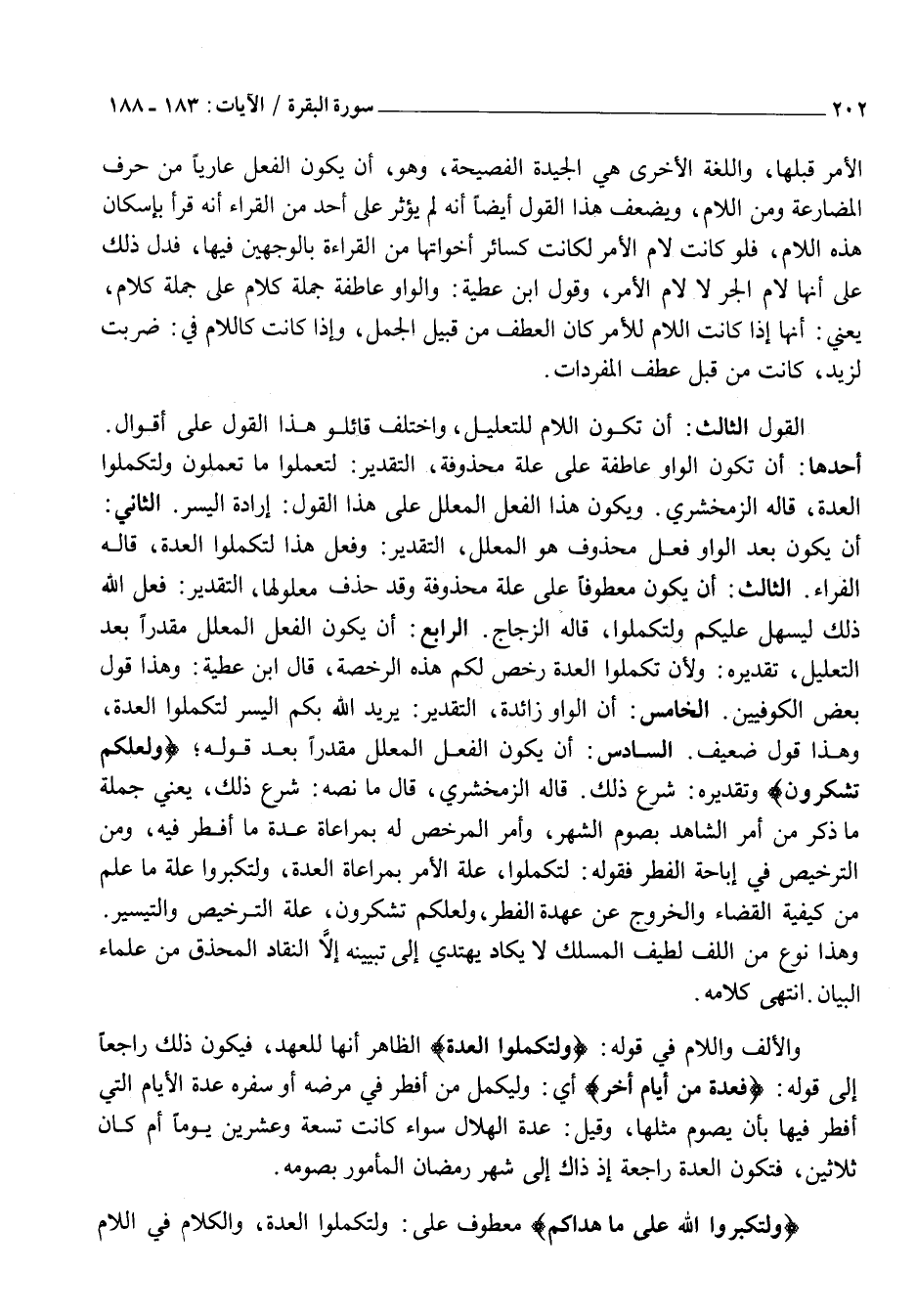 أَنْ يَكُونَ بَعْدَ الْوَاوِ فِعْلٌ مَحْذُوفٌ هُوَ الْمُعَلَّلُ، التَّقْدِيرُ: وَفَعَلَ هَذَا لِتُكْمِلُوا الْعِدَّةَ، قَالَهُ الْفَرَّاءُ. الثَّالِثُ: أَنْ يَكُونَ مَعْطُوفًا عَلَى عِلَّةٍ مَحْذُوفَةٍ وَقَدْ حُذِفَ مَعْلُولُهَا، التَّقْدِيرُ: فَعَلَ اللَّهُ ذَلِكَ لِيُسَهِّلَ عَلَيْكُمْ وَلِتُكْمِلُوا، قَالَهُ الزَّجَّاجُ. الرَّابِعُ: أَنْ يَكُونَ الْفِعْلُ الْمُعَلَّلُ مُقَدَّرًا بَعْدَ التَّعْلِيلِ، تَقْدِيرُهُ: وَلَأَنْ تُكْمِلُوا الْعِدَّةَ رَخَّصَ لَكُمْ هَذِهِ الرُّخْصَةَ، قَالَ ابْنُ عَطِيَّةَ: وَهَذَا قَوْلُ بَعْضِ الْكُوفِيِّينَ. الْخَامِسُ: أَنَّ الْوَاوَ زَائِدَةٌ، التَّقْدِيرُ: يُرِيدُ اللَّهُ بِكُمُ الْيُسْرَ لِتُكْمِلُوا الْعِدَّةَ، وَهَذَا قَوْلٌ ضَعِيفٌ. السَّادِسُ: أَنْ يَكُونَ الْفِعْلُ الْمُعَلَّلُ مُقَدَّرًا بَعْدَ قَوْلِهِ وَلَعَلَّكُمْ تَشْكُرُونَ وَتَقْدِيرُهُ: شَرَعَ ذَلِكَ. قَالَهُ الزَّمَخْشَرِيُّ، قَالَ مَا نَصُّهُ: شَرَعَ ذَلِكَ، يَعْنِي جُمْلَةَ مَا ذُكِرَ مِنْ أَمْرِ الشَّاهِدِ بِصَوْمِ الشَّهْرِ، وَأَمْرِ الْمُرَخَّصِ لَهُ بِمُرَاعَاةِ عِدَّةِ مَا أَفْطَرَ فِيهِ، وَمِنَ التَّرْخِيصِ فِي إِبَاحَةِ الْفِطْرِ فَقَوْلُهُ: لِتُكْمِلُوا، عِلَّةُ الْأَمْرِ بِمُرَاعَاةِ الْعِدَّةِ، وَلِتُكَبِّرُوا عِلَّةُ مَا عَلَّمَ مِنْ كَيْفِيَّةِ الْقَضَاءِ وَالْخُرُوجِ عَنْ عُهْدَةِ الْفِطْرِ، وَلَعَلَّكُمْ تَشْكُرُونَ، عِلَّةُ التَّرْخِيصِ وَالتَّيْسِيرِ.