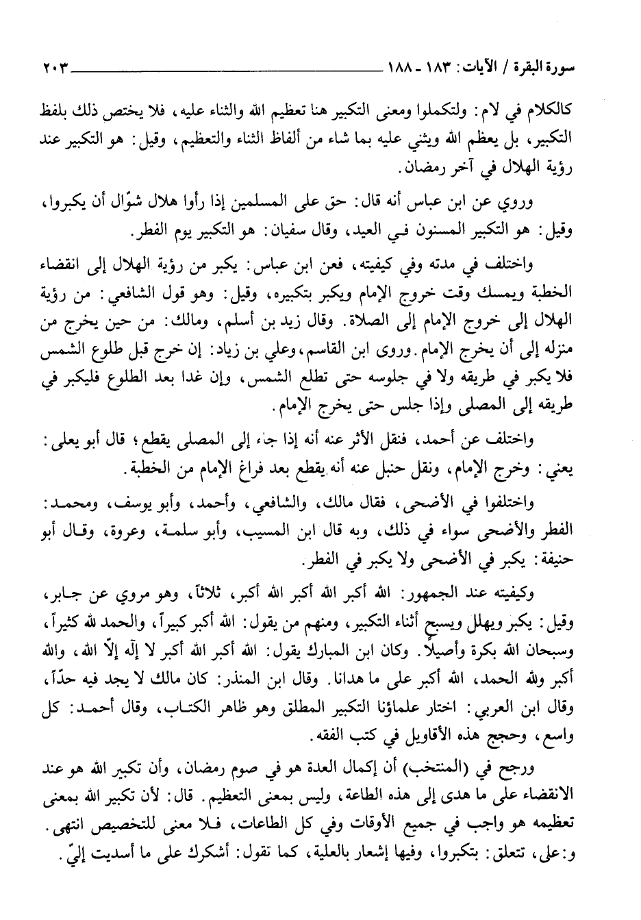وَرُوِيَ عَنِ ابْنِ عَبَّاسٍ أَنَّهُ قَالَ: حَقٌّ عَلَى الْمُسْلِمِينَ إِذَا رَأَوْا هِلَالَ شَوَّالٍ أَنْ يُكَبِّرُوا، وَقِيلَ: هُوَ التَّكْبِيرُ الْمَسْنُونُ فِي الْعِيدِ، وَقَالَ سُفْيَانُ: هُوَ التَّكْبِيرُ يَوْمَ الْفِطْرِ.