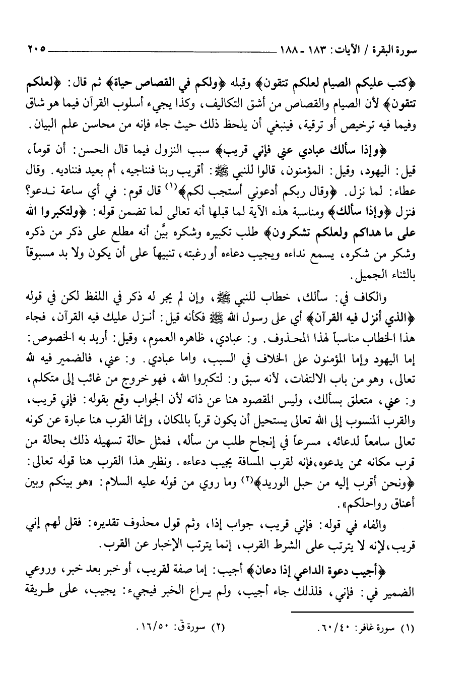 فَنَزَلَ وَإِذا سَأَلَكَ وَمُنَاسَبَةُ هَذِهِ الْآيَةِ لِمَا قَبْلَهَا أَنَّهُ تَعَالَى لَمَّا تَضَمَّنَ قَوْلُهُ: وَلِتُكَبِّرُوا اللَّهَ عَلى مَا هَداكُمْ وَلَعَلَّكُمْ تَشْكُرُونَ طَلَبَ تَكْبِيرِهِ وَشُكْرِهِ بَيَّنَ أَنَّهُ مُطَّلِعٌ عَلَى ذِكْرِ مَنْ ذَكَرَهُ وَشُكْرِ مَنْ شَكَرَهُ، يَسْمَعُ نِدَاءَهُ وَيُجِيبُ دُعَاءَهُ أو رغبته، تَنْبِيهًا عَلَى أَنْ يَكُونَ وَلَا بُدَّ مَسْبُوقًا بِالثَّنَاءِ الْجَمِيلِ.