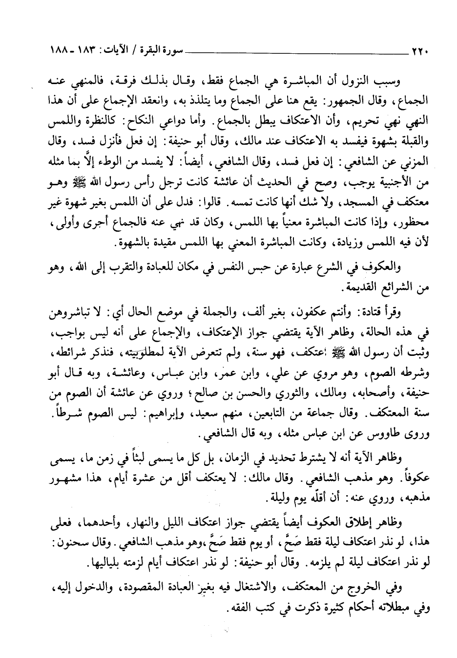 وَسَبَبُ النُّزُولِ أَنَّ الْمُبَاشَرَةَ هِيَ الْجِمَاعُ فَقَطْ، وَقَالَ بِذَلِكَ فِرْقَةٌ، فَالْمَنْهِيُّ عَنْهُ الْجِمَاعُ، وَقَالَ الْجُمْهُورُ: يَقَعُ هُنَا عَلَى الْجِمَاعِ وَمَا يُتَلَذَّذُ بِهِ، وَانْعَقَدَ الْإِجْمَاعُ عَلَى أَنَّ هَذَا النَّهْيَ نَهْيُ تَحْرِيمٍ، وَأَنَّ الِاعْتِكَافَ يَبْطُلُ بِالْجِمَاعِ. وَأَمَّا دَوَاعِي النِّكَاحِ: كَالنَّظْرَةِ وَاللَّمْسِ وَالْقُبْلَةِ بِشَهْوَةٍ فَيَفْسُدُ بِهِ الِاعْتِكَافُ عِنْدَ مَالِكٍ، وَقَالَ أَبُو حَنِيفَةَ: إِنْ فَعَلَ فَأَنْزَلَ فَسَدَ، وَقَالَ الْمُزَنِيُّ عَنِ الشَّافِعِيِّ: إِنْ فَعَلَ فَسَدَ، وَقَالَ الشَّافِعِيُّ، أَيْضًا: لَا يَفْسُدُ مِنَ الْوَطْءِ إِلَّا بِمَا مِثْلُهُ مِنَ الْأَجْنَبِيَّةِ يُوجِبُ، وَصَحَّ