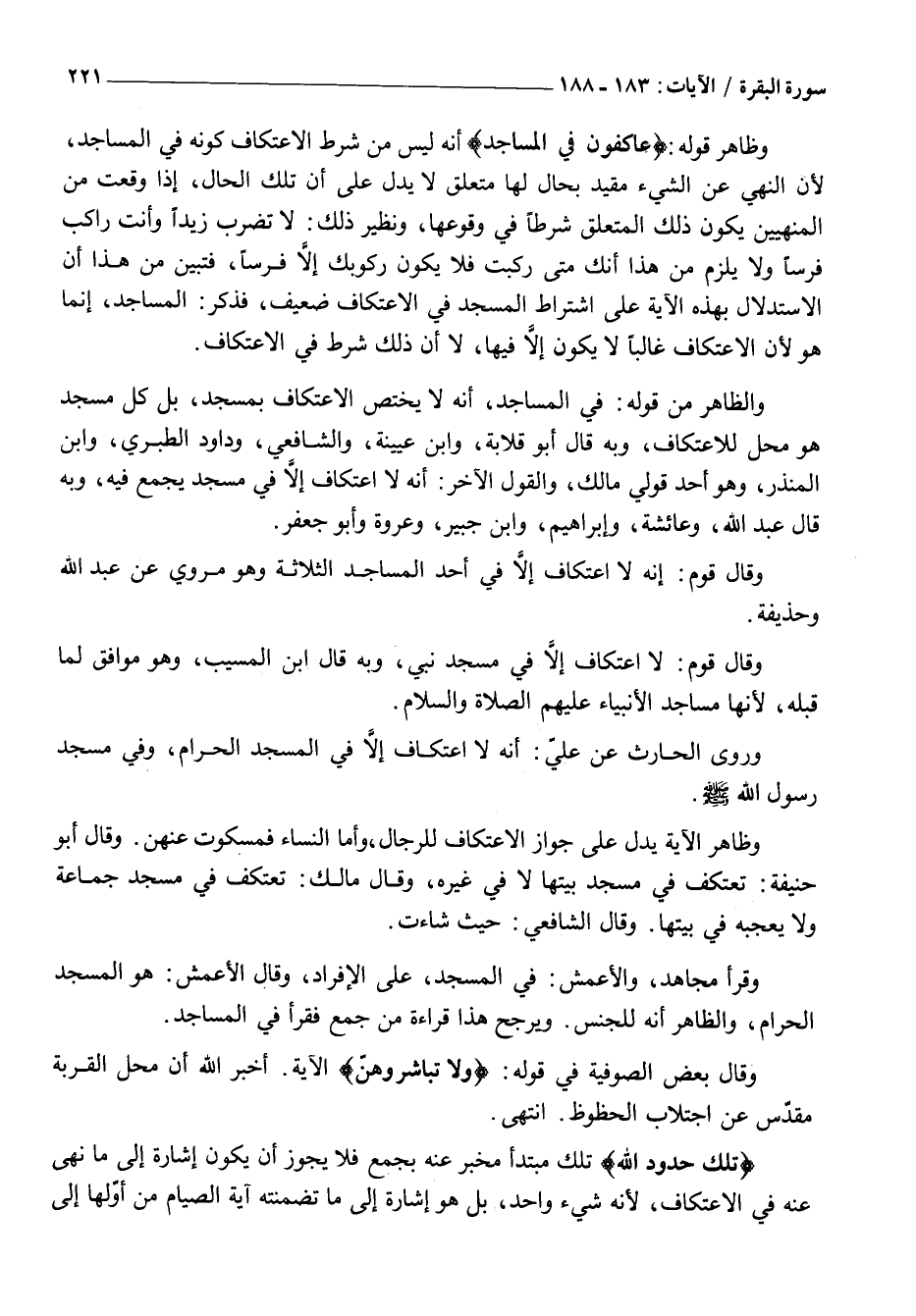 وَالظَّاهِرُ مِنْ قَوْلِهِ: فِي الْمَسَاجِدِ، أَنَّهُ لَا يَخْتَصُّ الِاعْتِكَافُ بِمَسْجِدٍ، بَلْ كُلُّ مَسْجِدٍ هُوَ مَحَلٌّ لِلِاعْتِكَافِ، وَبِهِ قَالَ أَبُو قِلَابَةَ، وَابْنُ عُيَيْنَةَ، وَالشَّافِعِيُّ، وَدَاوُدُ الطَّبَرِيُّ، وَابْنُ الْمُنْذِرِ، وَهُوَ أَحَدُ قَوْلَيْ مَالِكٍ، والقول الآخر: أنه لا اعتكاف إلا في مسجد يُجْمَعُ فِيهِ، وَبِهِ قَالَ عَبْدُ اللَّهِ، وَعَائِشَةُ، وَإِبْرَاهِيمُ، وَابْنُ جُبَيْرٍ، وَعُرْوَةُ وَأَبُو جَعْفَرٍ.