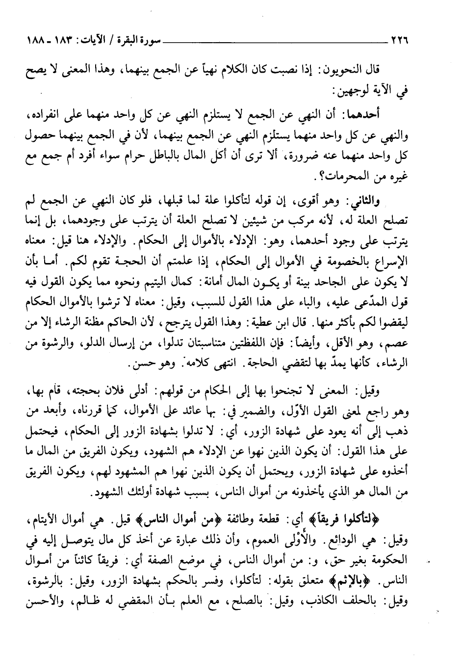 وَالثَّانِي: وَهُوَ أَقْوَى، أَنَّ قَوْلَهُ لِتَأْكُلُوا عِلَّةٌ لِمَا قَبْلَهَا، فَلَوْ كَانَ النَّهْيُ عَنِ الْجَمْعِ لَمْ تَصْلُحِ الْعِلَّةُ لَهُ، لِأَنَّهُ مُرَكَّبٌ مِنْ شَيْئَيْنِ لَا تَصْلُحُ الْعِلَّةُ أَنْ يَتَرَتَّبَ عَلَى وُجُودِهِمَا، بَلْ إِنَّمَا يَتَرَتَّبُ عَلَى وُجُودِ أَحَدِهِمَا، وَهُوَ: الْإِدْلَاءُ بِالْأَمْوَالِ إِلَى الْحُكَّامِ. وَالْإِدْلَاءُ هُنَا قِيلَ: مَعْنَاهُ الْإِسْرَاعُ بِالْخُصُومَةِ فِي الْأَمْوَالِ إِلَى الْحُكَّامِ، إِذَا عَلِمْتُمْ أَنَّ الْحُجَّةَ تَقُومُ لَكُمْ. إِمَّا بِأَنْ لَا يَكُونَ عَلَى الْجَاحِدِ بَيِّنَةٌ أَوْ يَكُونَ الْمَالُ أَمَانَةً: كَمَالِ الْيَتِيمِ وَنَحْوِهِ مِمَّا يَكُونُ الْقَوْلُ فِيهِ قَوْلَ الْمُدَّعَى عَلَيْهِ، وَالْبَاءُ عَلَى هَذَا الْقَوْلِ لِلسَّبَبِ، وَقِيلَ: مَعْنَاهُ لَا تَرْشُوا بِالْأَمْوَالِ الْحُكَّامَ لِيَقْضُوا لَكُمْ بِأَكْثَرَ مِنْهَا. قَالَ ابْنُ عَطِيَّةَ: وَهَذَا الْقَوْلُ يَتَرَجَّحُ، لِأَنَّ الْحَاكِمَ مَظِنَّةُ الرِّشَاءِ إِلَّا مَنْ عُصِمَ، وَهُوَ الْأَقَلُّ، وَأَيْضًا: فَإِنَّ اللَّفْظَتَيْنِ مُتَنَاسِبَتَانِ تُدْلُوا، مِنْ إِرْسَالِ الدَّلْوِ، وَالرِّشْوَةُ مِنَ الرِّشَاءِ، كَأَنَّهَا يُمَدُّ بِهَا لِتُقْضَى الْحَاجَةُ. انْتَهَى كَلَامُهُ. وَهُوَ حَسَنٌ.